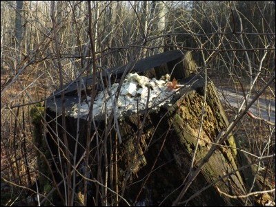 Pozostałe pnie po ściętych dębach zasiedliły natomiast inne gatunki. Jeden z nich stał się domem dla żółciaka siarkowego (Laetiporus sulphureus). Co prawda już w stanie zejściowym ale to jest już pewna wskazówka gdzie go można pozyskać w celach kulinarnych, oczywiście w następnym okresie wegetacji. Obok niego na innym pniu zadomowiły się: Patinellaria sanguinea oraz Eriopezia caesia. Oba gatunki pospolite w tym rejonie. O ile Eriopezia caesia jest przywiązana do tego substratu to Patinellaria sanguinea występuje na różnym substracie liściastym.