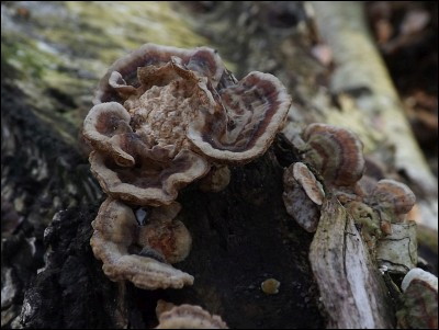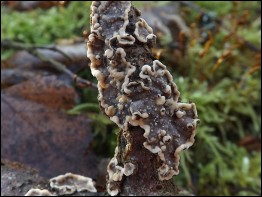 No cóż w takich miejscach nie trudno potknąć się o grube pędy złamanych leszczyn. Również na nich możemy spotkać ciekawe grzyby. Na tej na którą natknąłem się znalazłem kilka gatunków. Pospolita u mnie na tym substracie fałdówka kędzierzawa (Plicaturopsis crispa). Nieopodal niej usadowił się już nieco po przejściach łycznik późny (Panellus serotinus) oraz rzadziej spotykany gatunek orzechówki (Encoelia furfuracea).