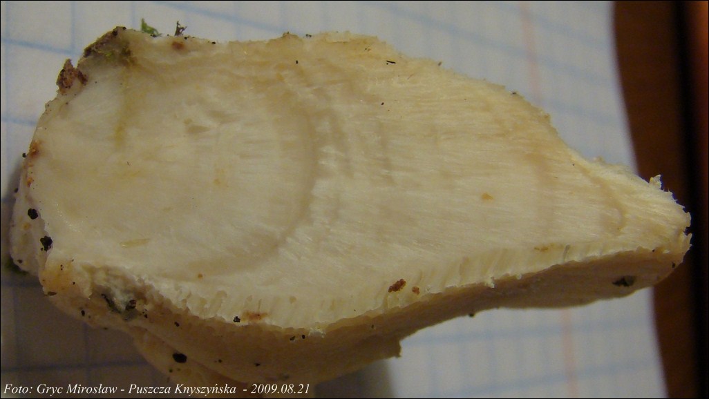Miąższ:, włóknisty, mocno wilgotny, lekko strefowany w przekroju(patrz zdjęcie nr.14), o przyjemnym zapachu i lekko gorzkawym lub kwaskawym smaku.