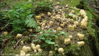 Stary las puszczański, mieszany, pniak świerkowy, kilkadziesiąt owocników na jednym pniu.
