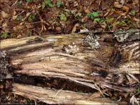 Grupka owocników na dolnej stronie leżącego na ziemi, mocno zbutwiałego kloca brzozowego.