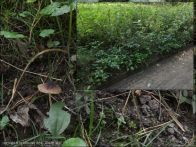 Las iglasty, zachwaszczone przydroże, ziemia.