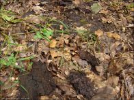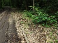Las mieszany, przydroże, ziemia usłana resztkami drewna.