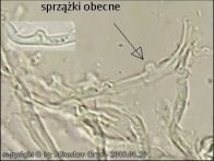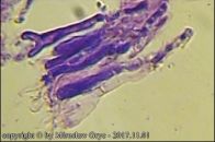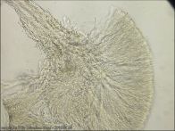 Można nawet pokusić się o stwierdzenie, że sam owocnik pozbawiony jest praktycznie warstwy środkowej. Warstwa hymeniałna praktycznie wyrasta bezpośrednio nad strzępkami trzonu, który systematycznie poszerza się od podstawy w górę. Zbudowany jest z (+/-) równolegle ułożonych, septowanych, hialinowych strzępek, coraz bardziej rozwidlających się ku górze. Z tego też powodu obserwacja jego wewnetrznej budowy jest utrudniona. Strzępki, zarówno trzonu jak i części hymenialnej trudno rozwarstwiają się wobec tego lepsze efekty można uzyskać po namoczeniu preparatu w 5% roztworze wodnym KOH.