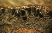 Owocniki na martwych gałązkach olszy (Alnus sp.).