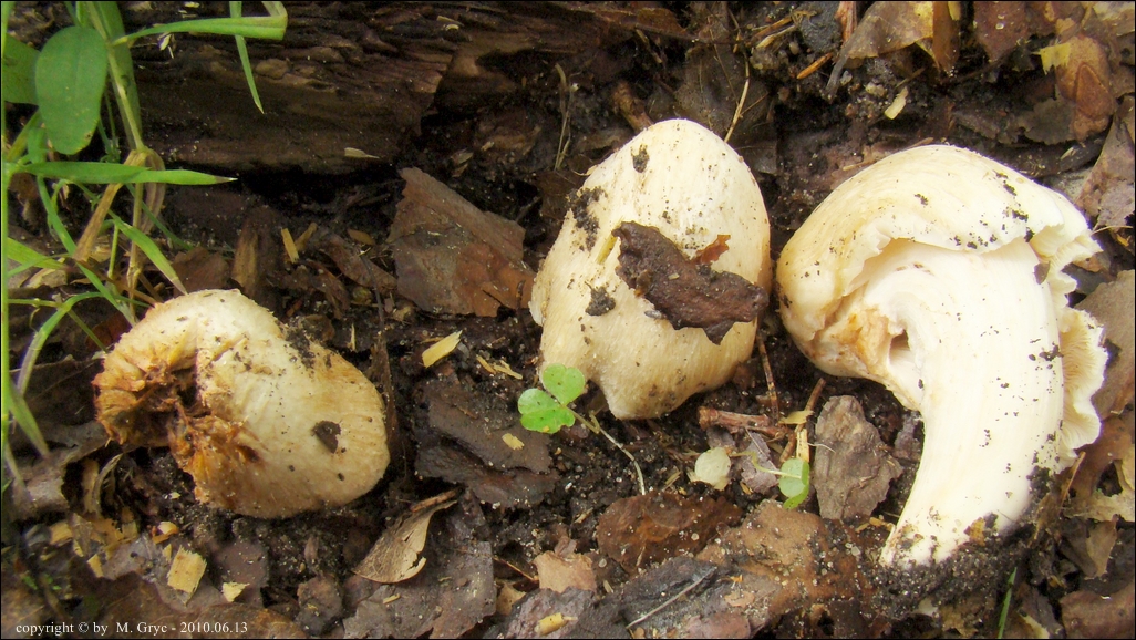 Blaszki: początkowo białawe, następnie kremowe (różowiejące), aż w końcu szarawo zabarwione przez zarodniki, wąsko wykrojone; ostrze biało orzęsione.