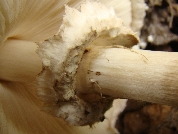 Miąższ: barwy białej ale po uszkodzeniu szybko czerwieniejący, szczególnie w trzonie, co widać podczas zbiorów, po obcięciu trzonu; w kapeluszu miękki, w trzonie wóknisty, nie nadający się do spożycia; smak łagodny; zapachu w zasadzie brak.