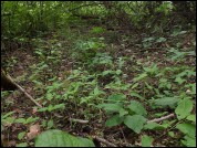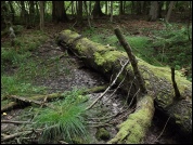 Wilgotna niecka w terenie (dzicze babrzysko), porośnięta liściastymi.