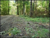 Stary las mieszany, przydroże, usłane resztkami drewna.