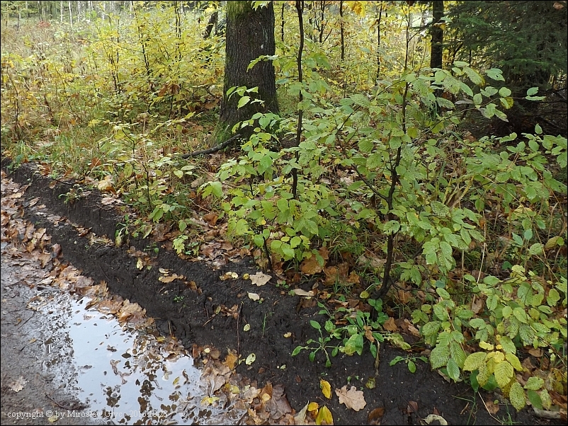 Luźne zadrzewienie liściaste na skraju drogi polnej, skraj błotnistej koleiny.