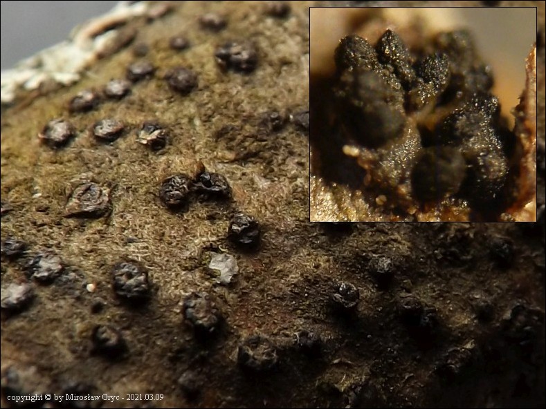 Gatunek pospolicie występujący na gałęziach jabłoni (Malus spp.). Jak zaobserwowano, nie wpływa jednak w znacznym stopniu na osłabienie kondycji gpspodarza. Zasiedla raczej części mocno osłabione, często przemrozone przez silne mrozy.