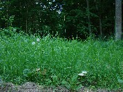 Las liściasty, trawiaste rozdroże, ziemia usypana trocinami.