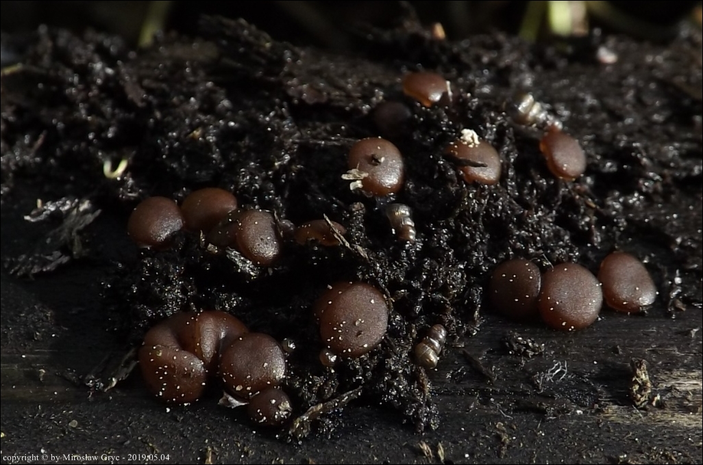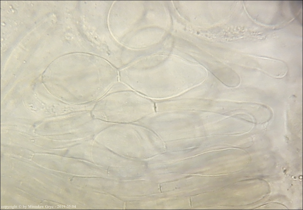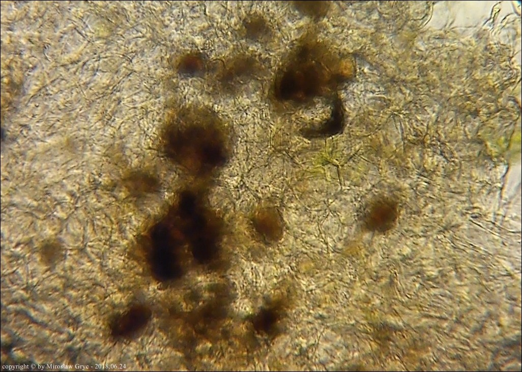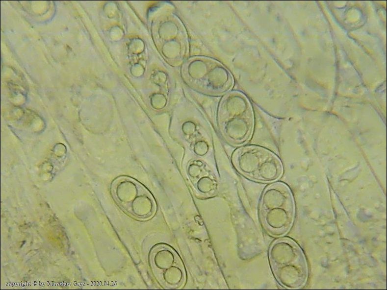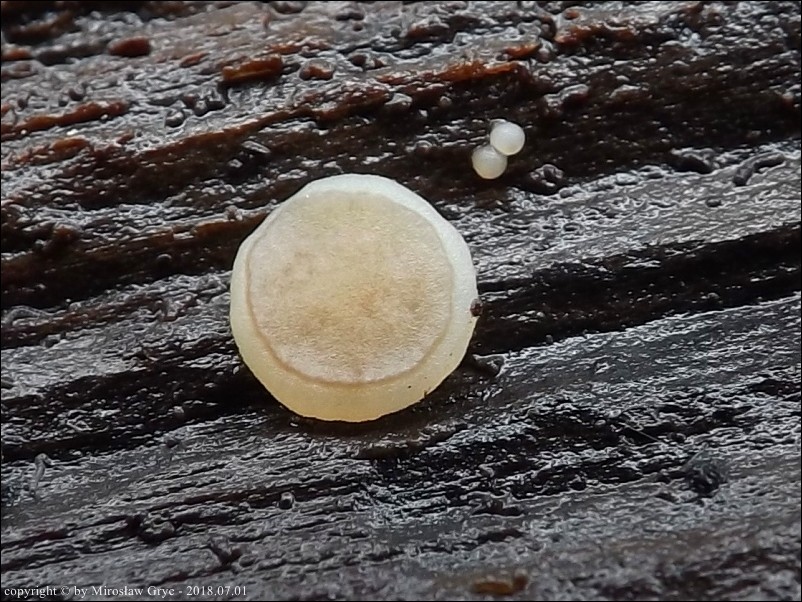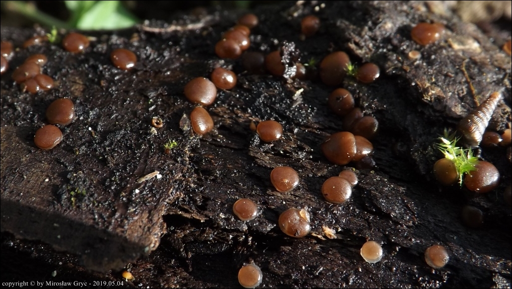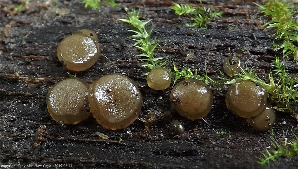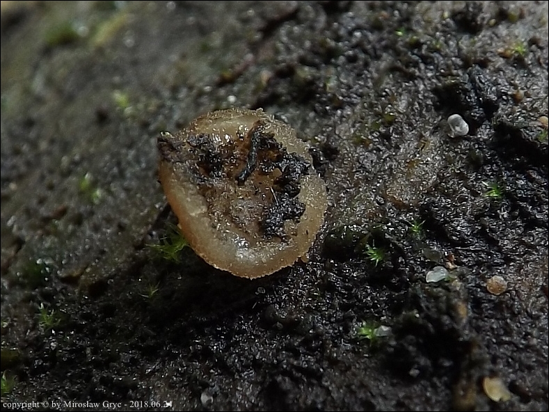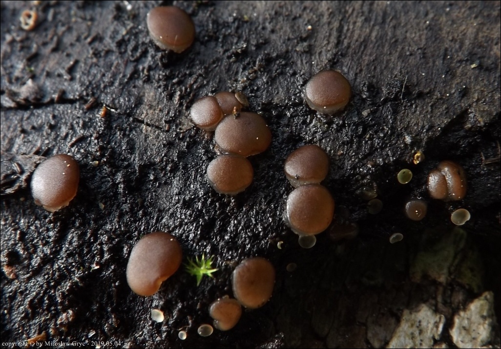 Substrat: Grupka owocników na wewnętrznej stronie kory, powalonej marwej olszy (Alnus sp.).
