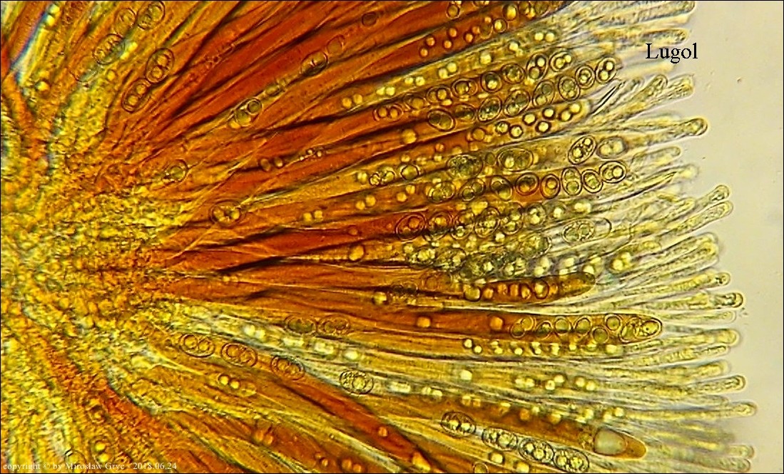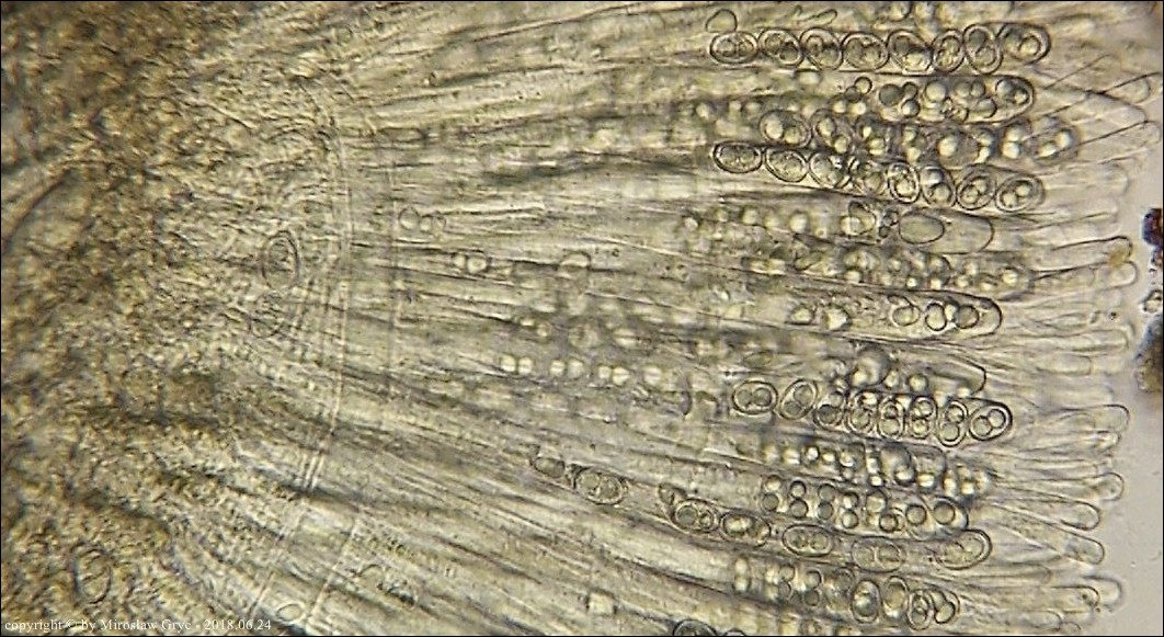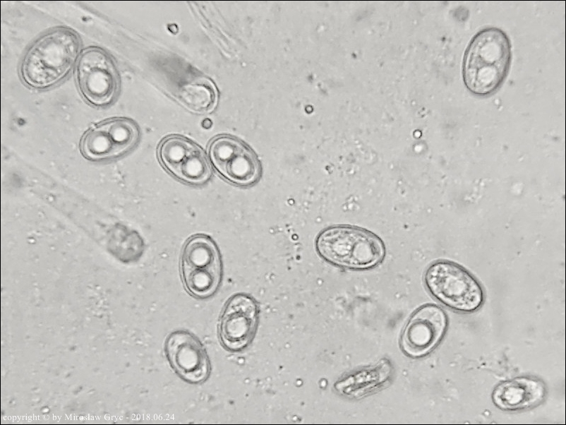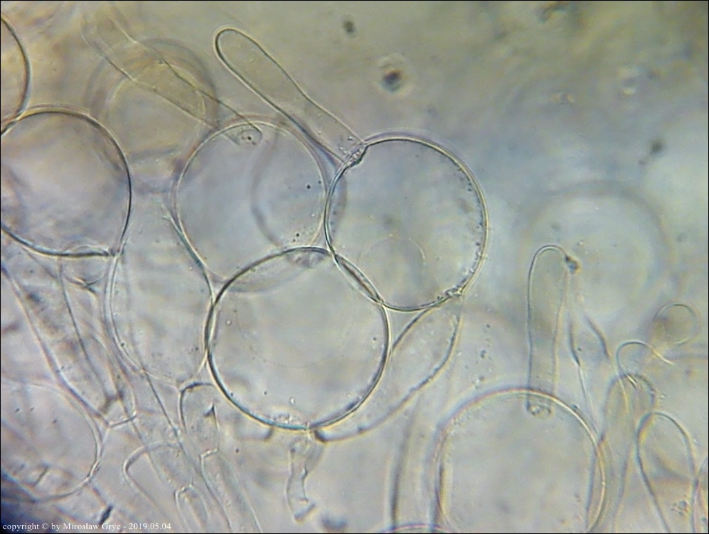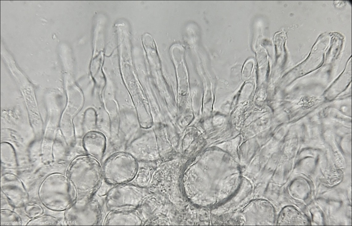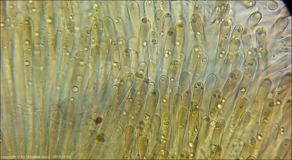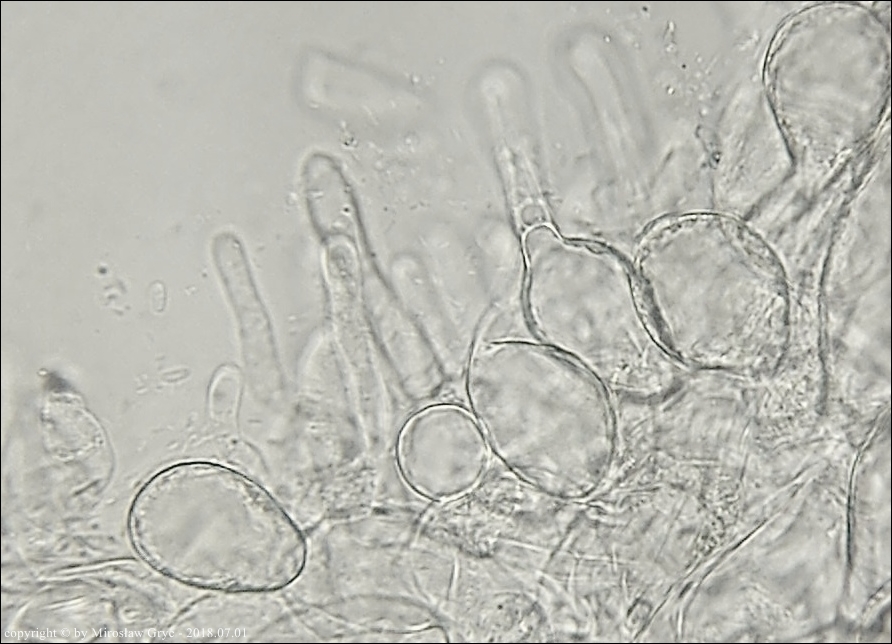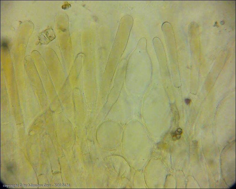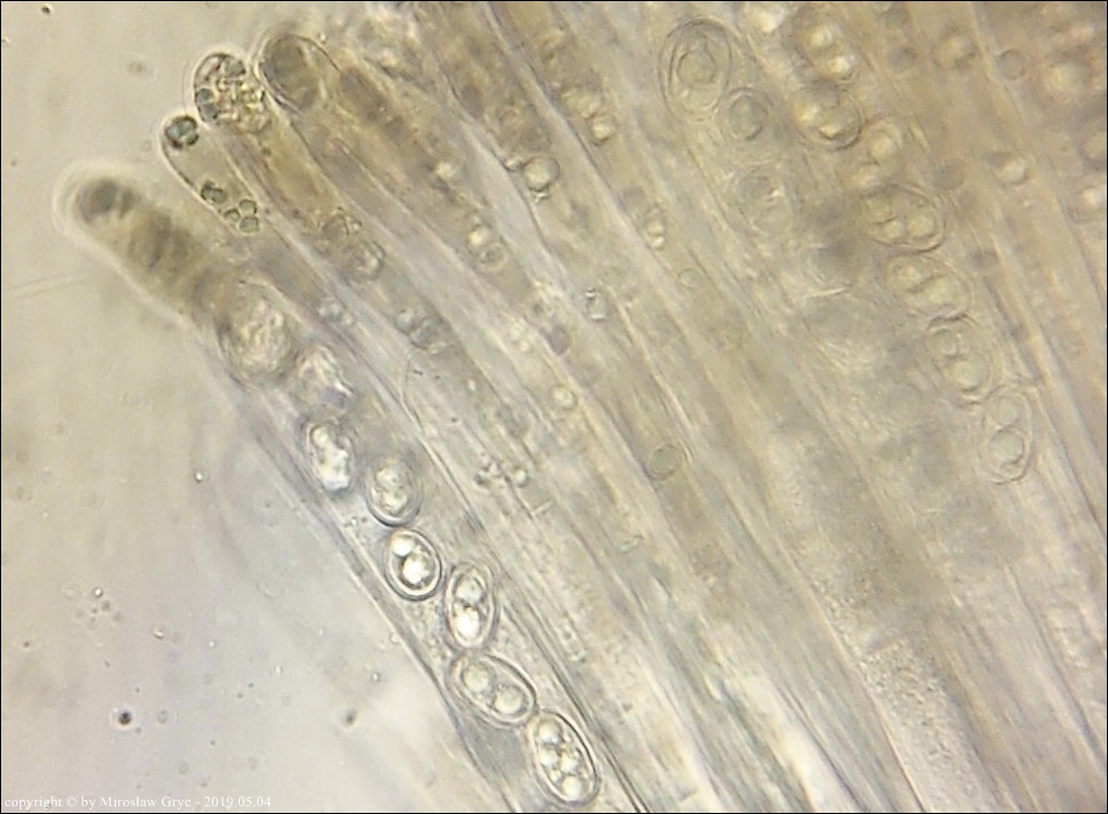 Substrat: Grupka owocników na wewnętrznej stronie kory, powalonej marwej olszy (Alnus sp.).