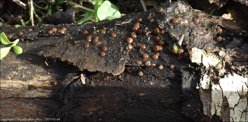 Substrat: Owocniki masowo na butwiejącym pniu brzozy leżącym na wilgotnej ziemi.