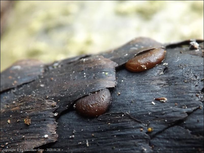 Substrat: Kilka owocników na nieco nietypowym substracie jakim jest dla tego gatunku szyszka świerkowa (Picea sp.) .