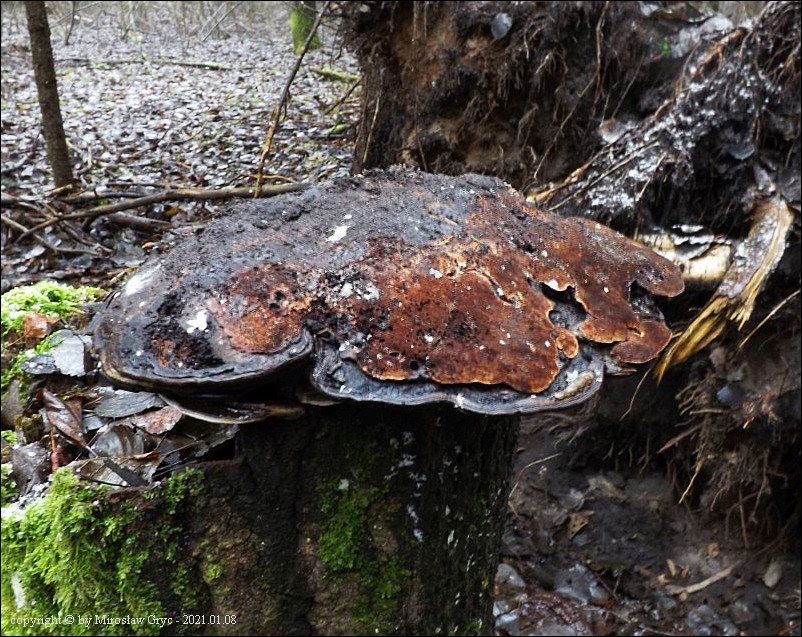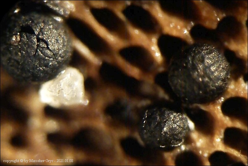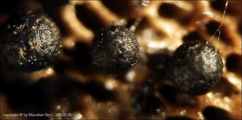 Notatka: Owocniki na hymenoforze martwej lakownicy spłaszconej (Ganoderma applanatum) .