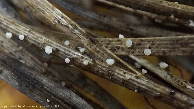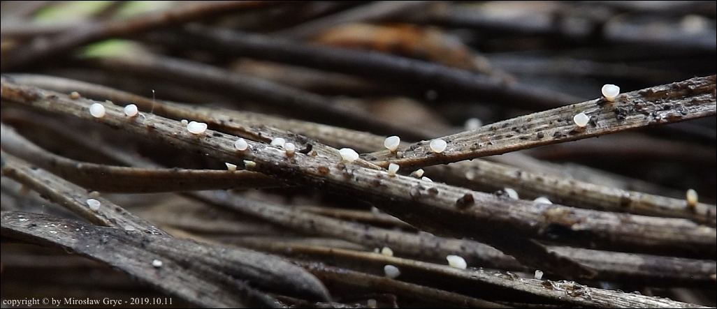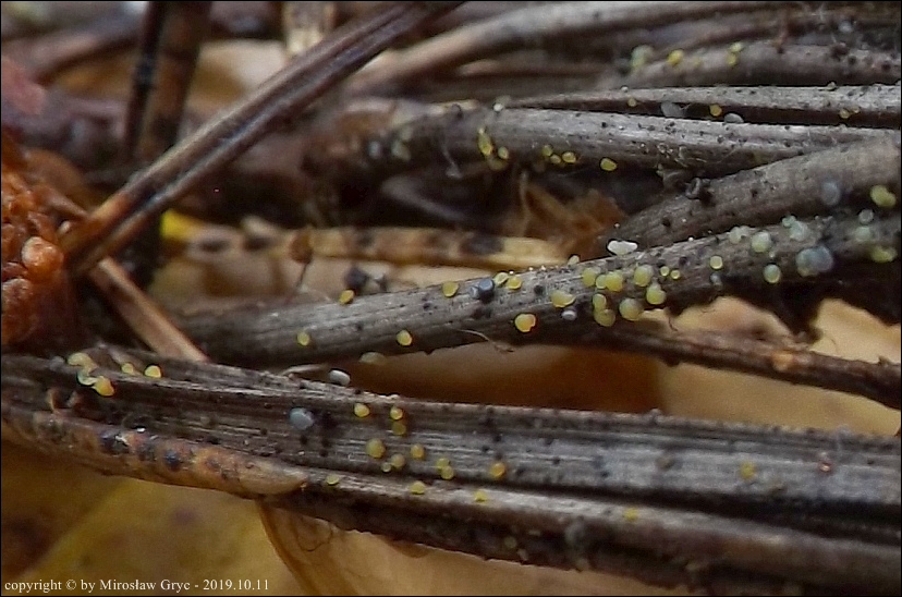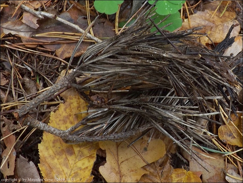 Substrat: Owocniki na sosnowych iglach przytwierdzonych do gałązki leżącej na ściółce.