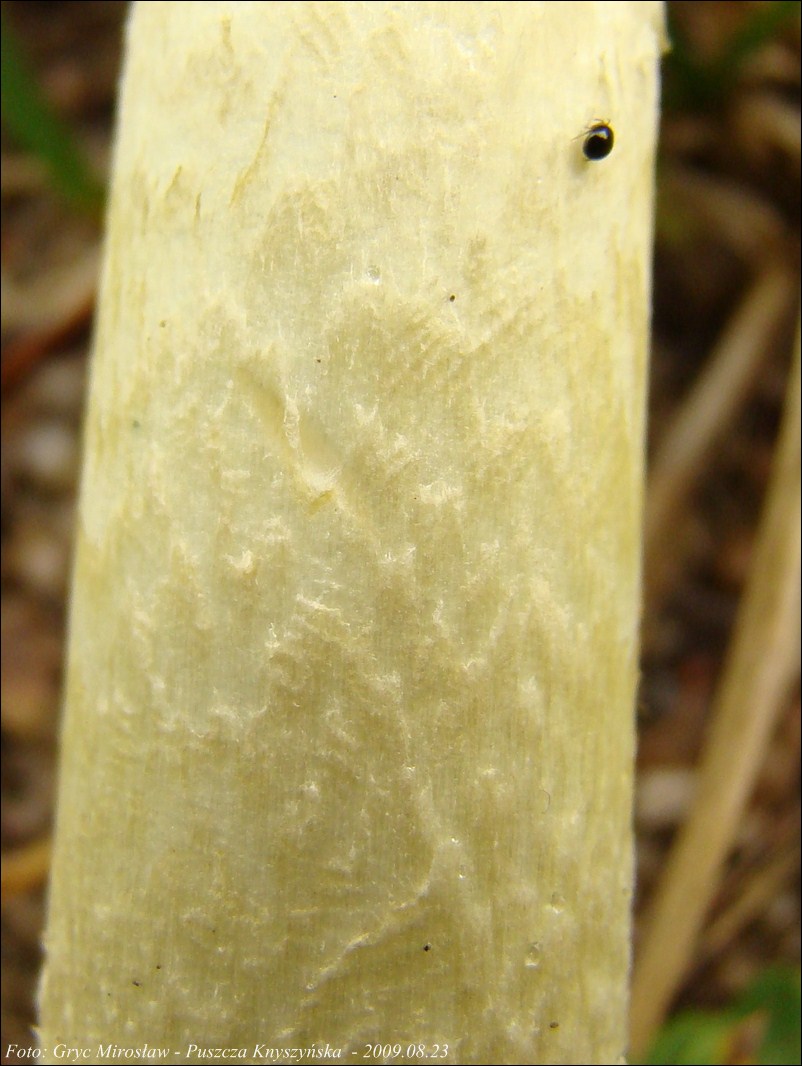 Pierścień: duży, zwisający, biały, gładki lub lekko prążkowany, w starszym wieku często odpada!