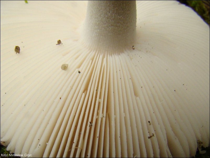 Kapelusz: występuje w barwach od zupełnie białej (odmiana albinistyczna) do popielatej; średnicą dorasta do 12 cm; brzeg kapelusza wyraźnie prążkowany już nawet w młodym wieku; powierzchnia gładka, w czasie wilgotnej pogody sprawiająca wrażenie lekko lepkiej, z rzadko obecnymi płatami z resztek osłony zupełnej.
