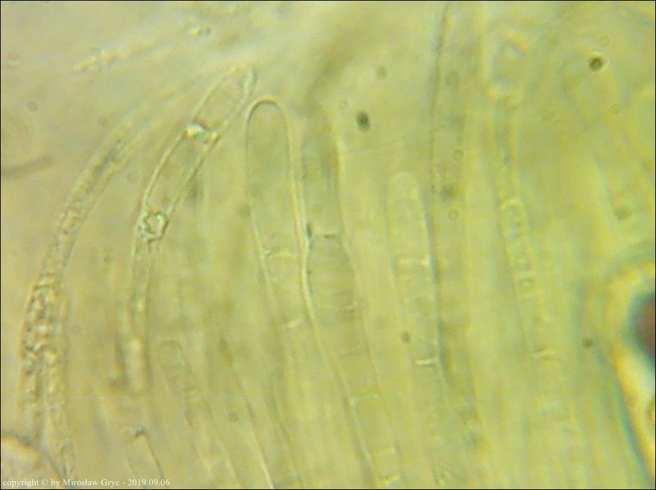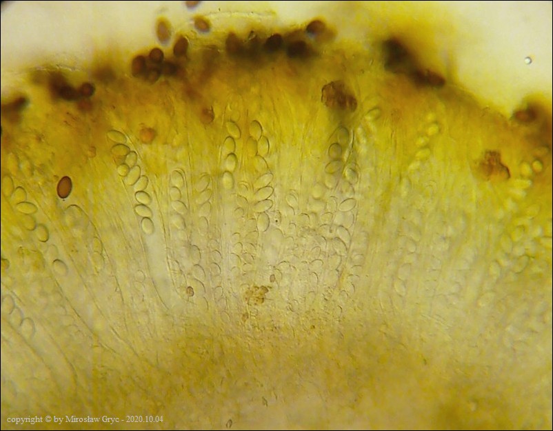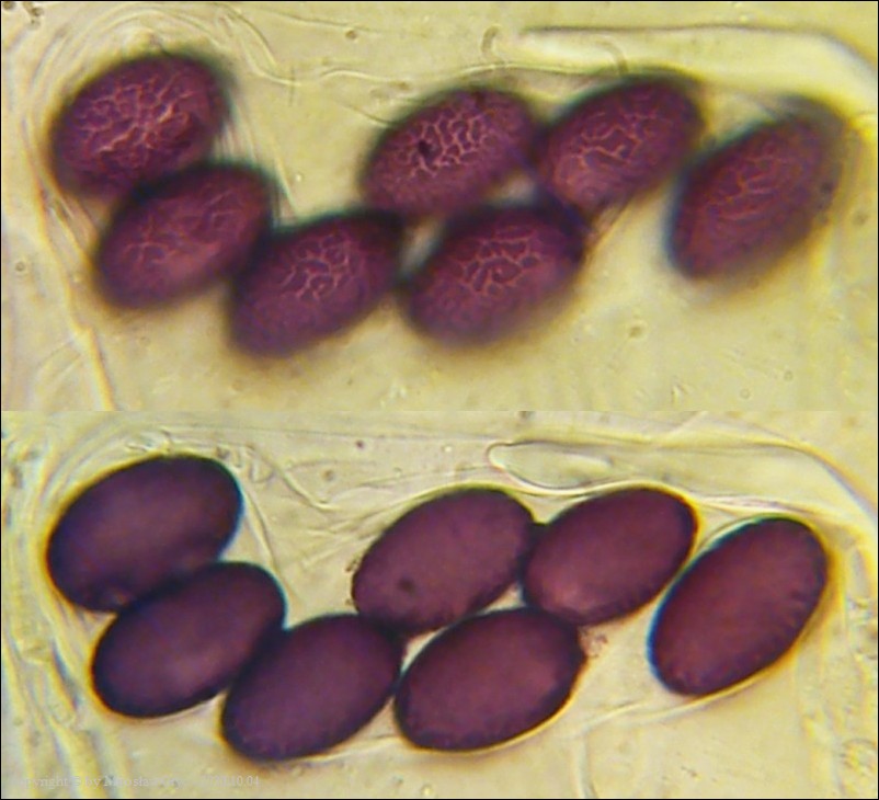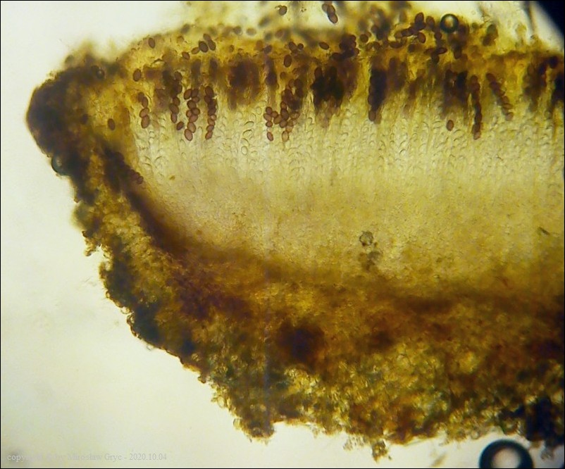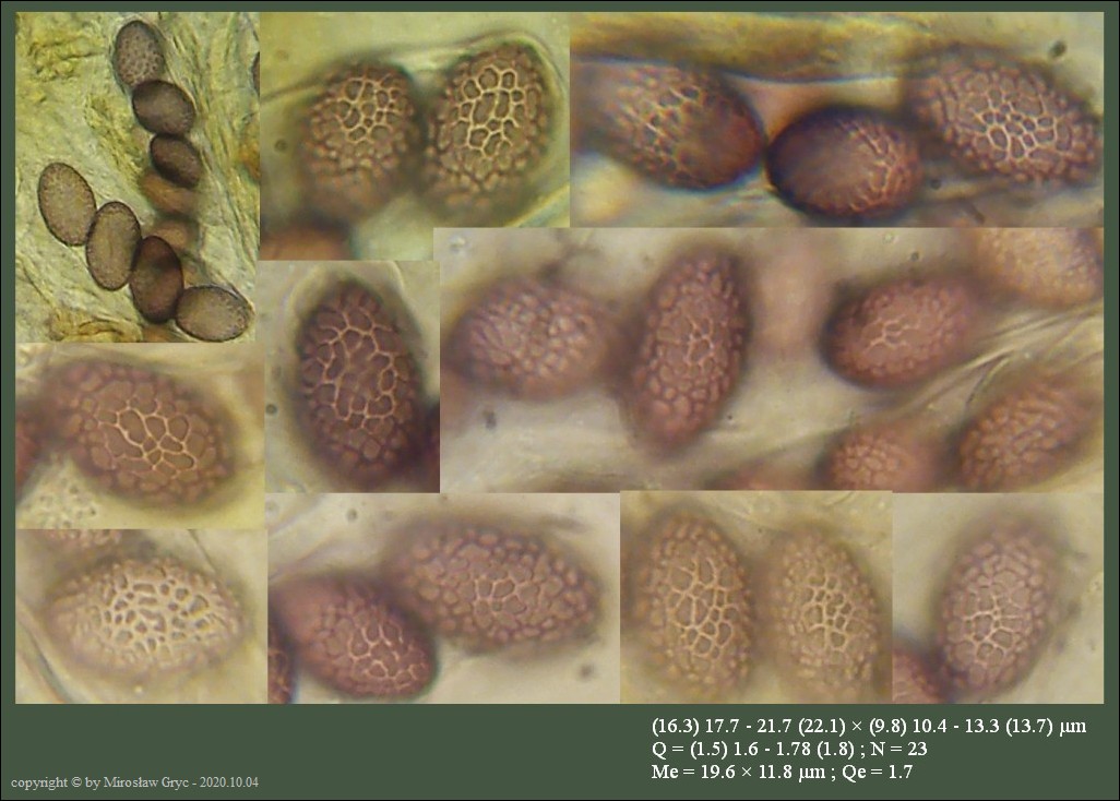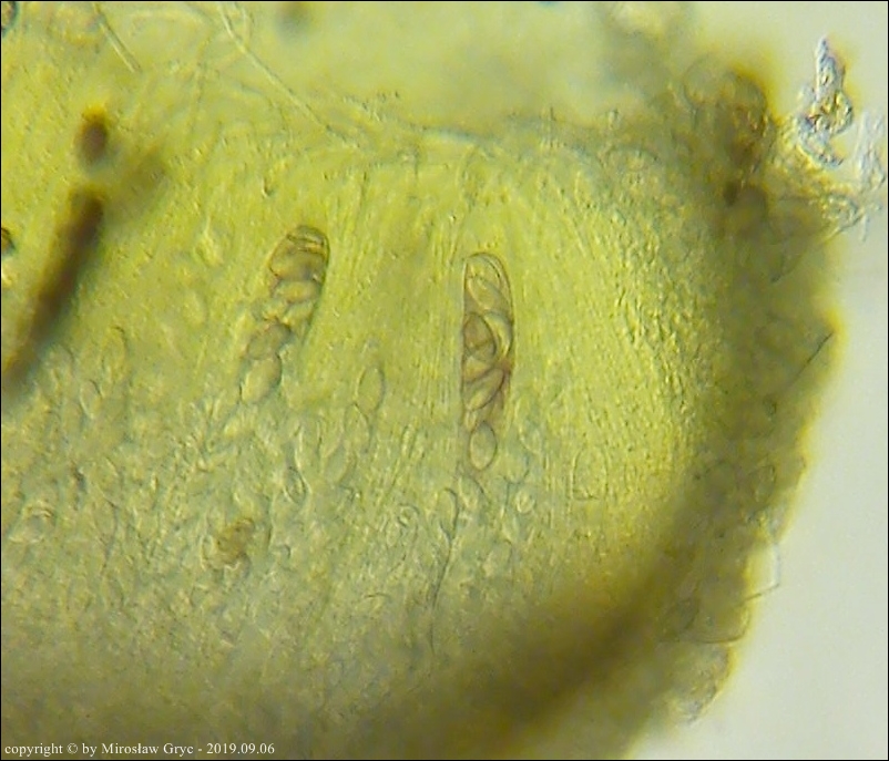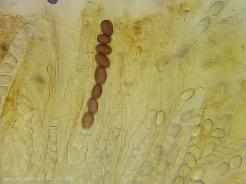 Uwagi: Wyrastał razem z Boubovia ovalispora. Oznaczenie uważam za niepewne ze względu na słaby materiał. Owocnik jak widać słabo dojrzały a co za tym idzie również brak całkowicie dojrzałych zarodników.