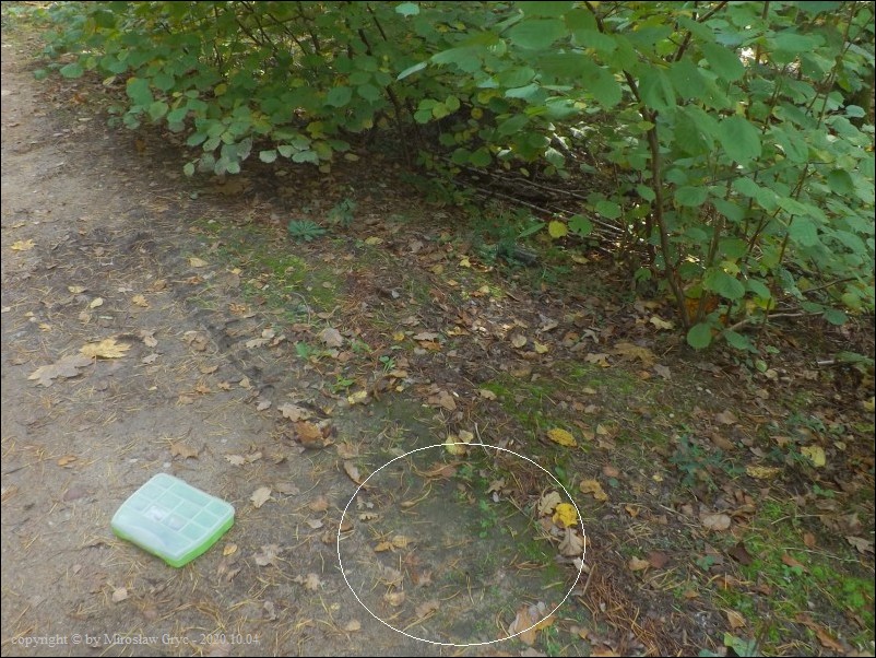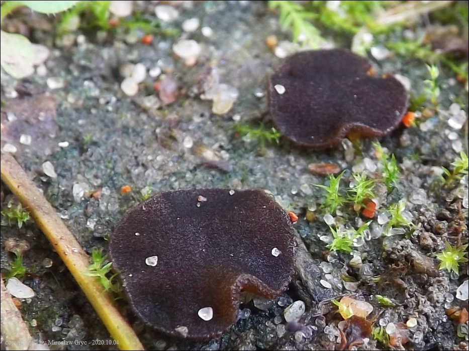 Siedlisko: Kilka owocników na żwirowym poboczu drogi leśnej w towarzystwie Peziza exogelatinosa.