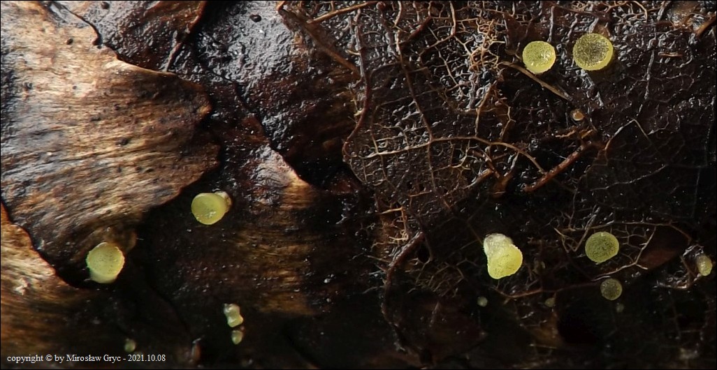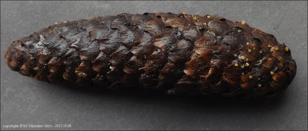 Substrat: Owocniki na świerkowej szyszce leżącej w zaroślach na skraju zadrzewienia.