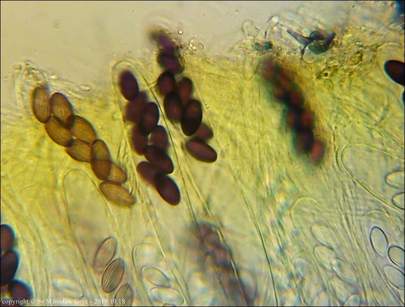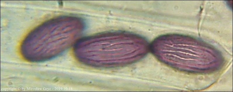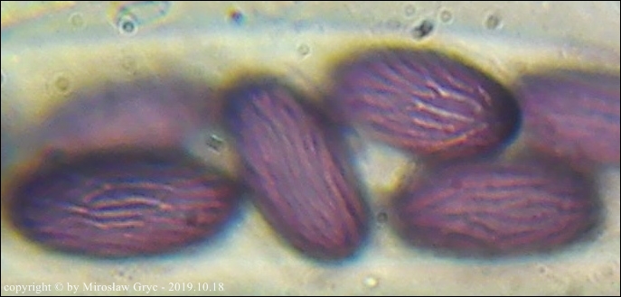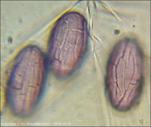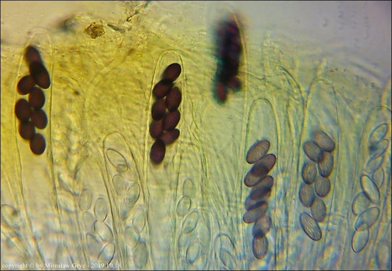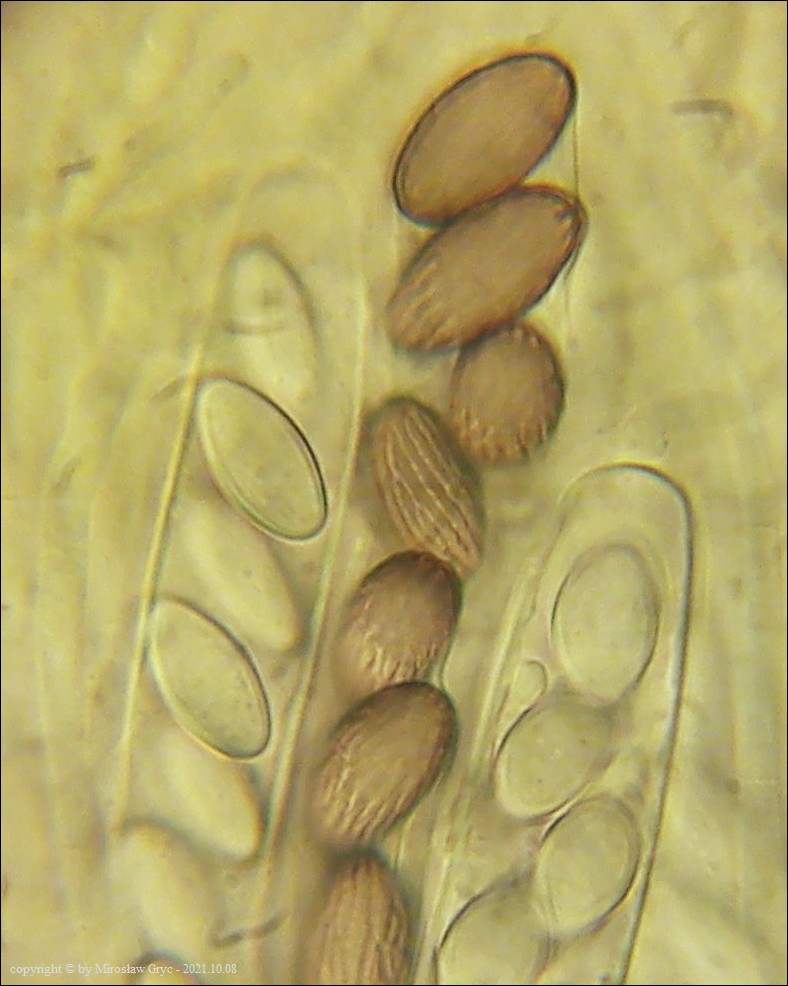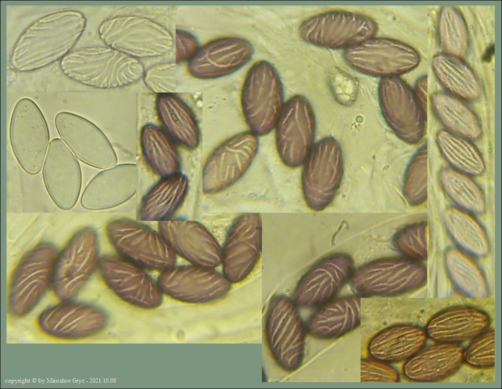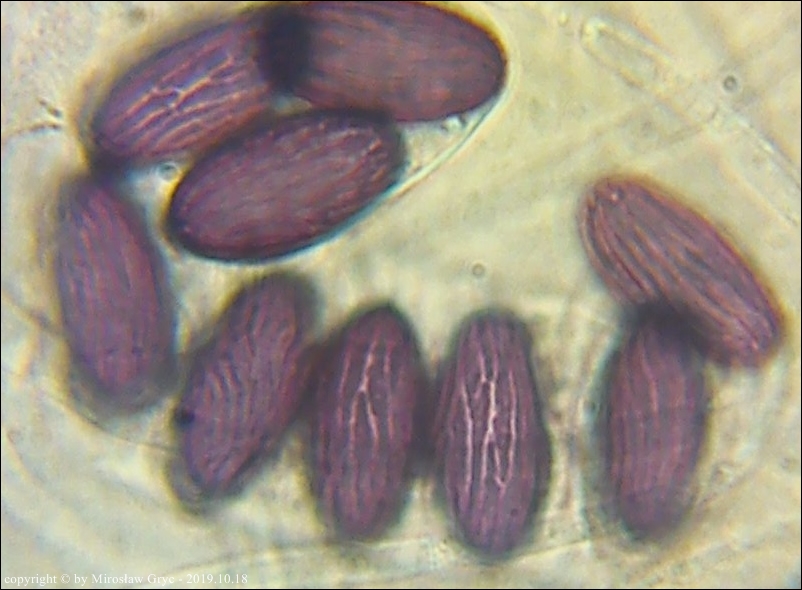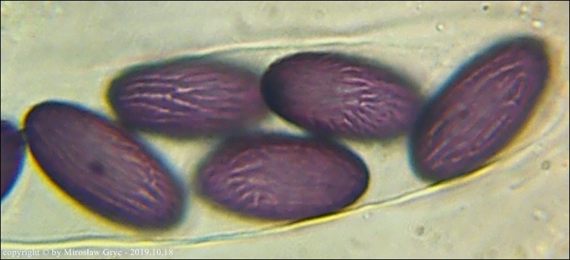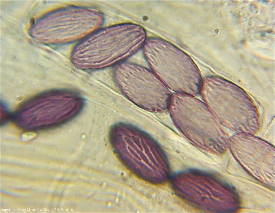 Notatka: W chwili znalezienia, na szyszce wyrastał jeden zupełnie niedojrzały owocnik. Pozostałe zostały wyhodowane w warunkach sztucznych, w amatorskiej dojrzewalni. Zarodniki: (15.8) 16.3 - 18.1 (18.2) × (7.9) 8.3 - 9.4 (9.7) µm Q = (1.8) 1.82 - 2.07 (2.1) ; N = 21 Me = 17.2 × 8.8 µm ; Qe = 2. Dolne partie worków pod wpływem lugolu lekko przebarwiają się na niebiesko.