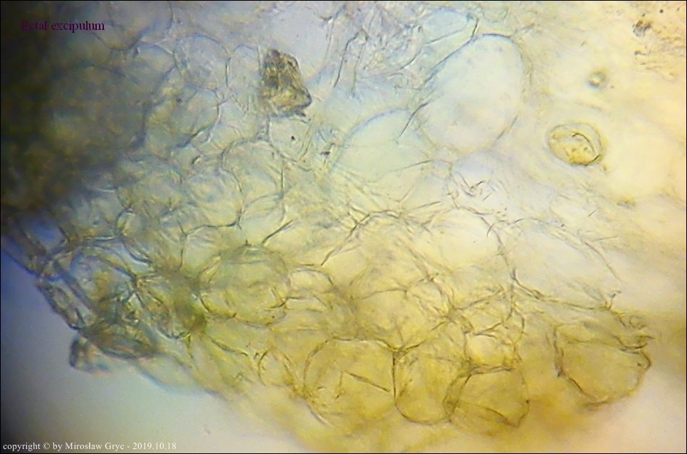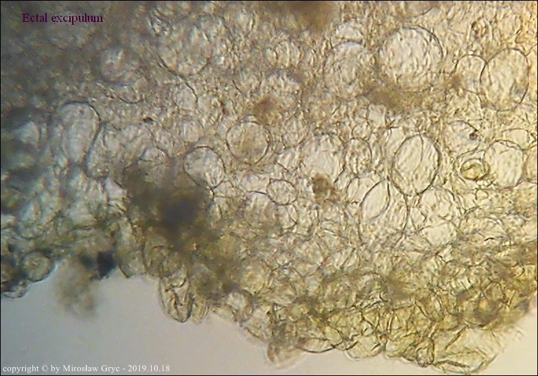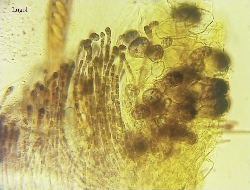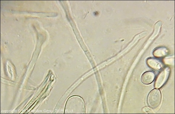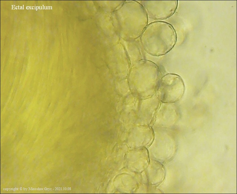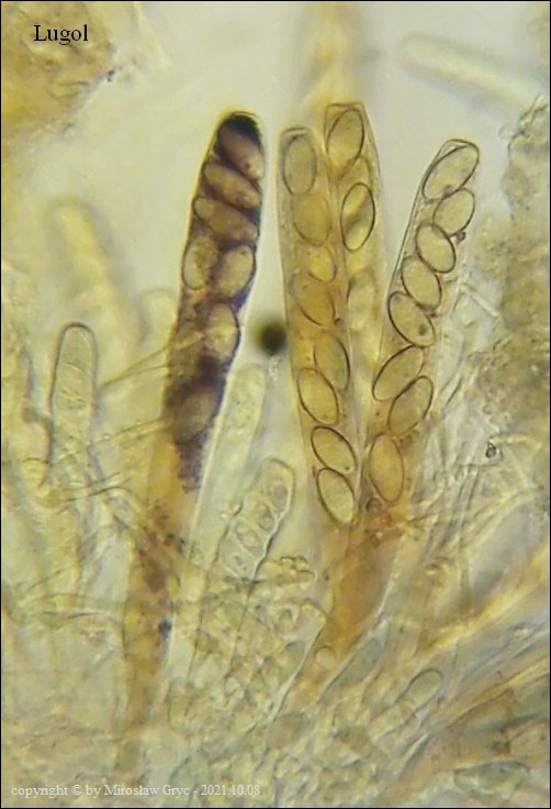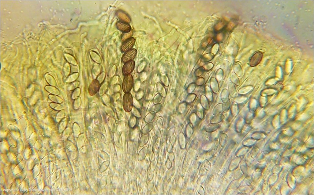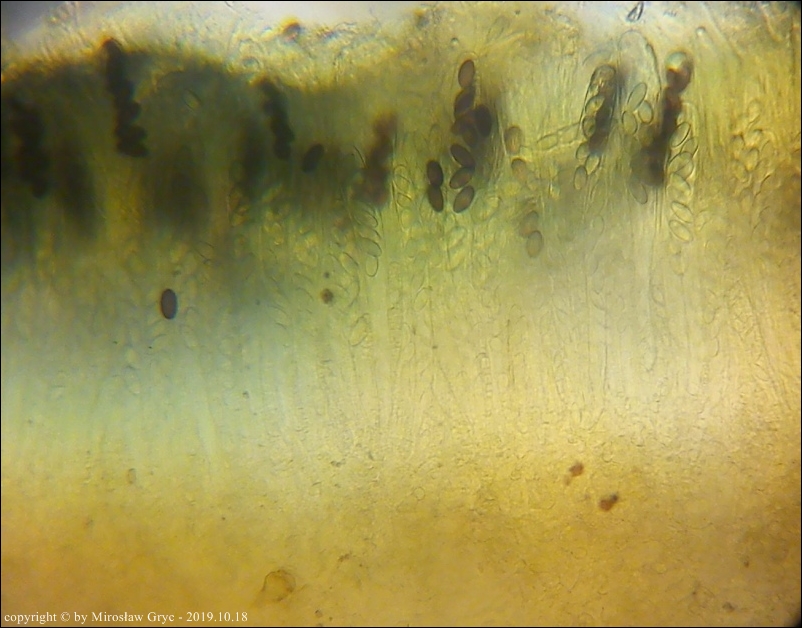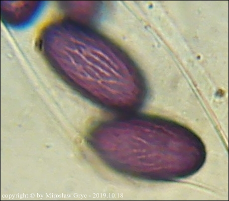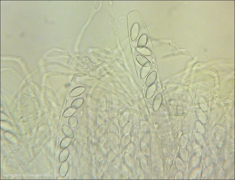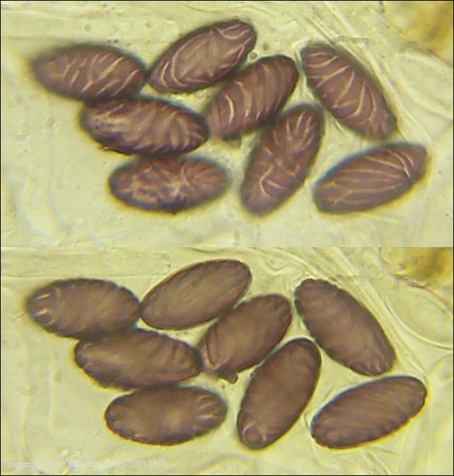 Notatka: W chwili znalezienia, na szyszce wyrastał jeden zupełnie niedojrzały owocnik. Pozostałe zostały wyhodowane w warunkach sztucznych, w amatorskiej dojrzewalni. Zarodniki: (15.8) 16.3 - 18.1 (18.2) × (7.9) 8.3 - 9.4 (9.7) µm Q = (1.8) 1.82 - 2.07 (2.1) ; N = 21 Me = 17.2 × 8.8 µm ; Qe = 2. Dolne partie worków pod wpływem lugolu lekko przebarwiają się na niebiesko.