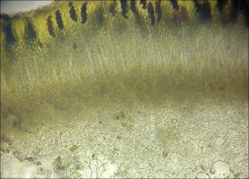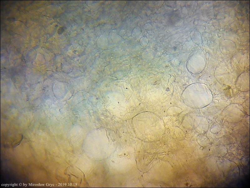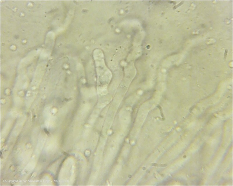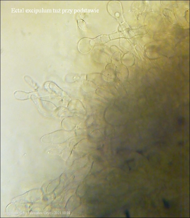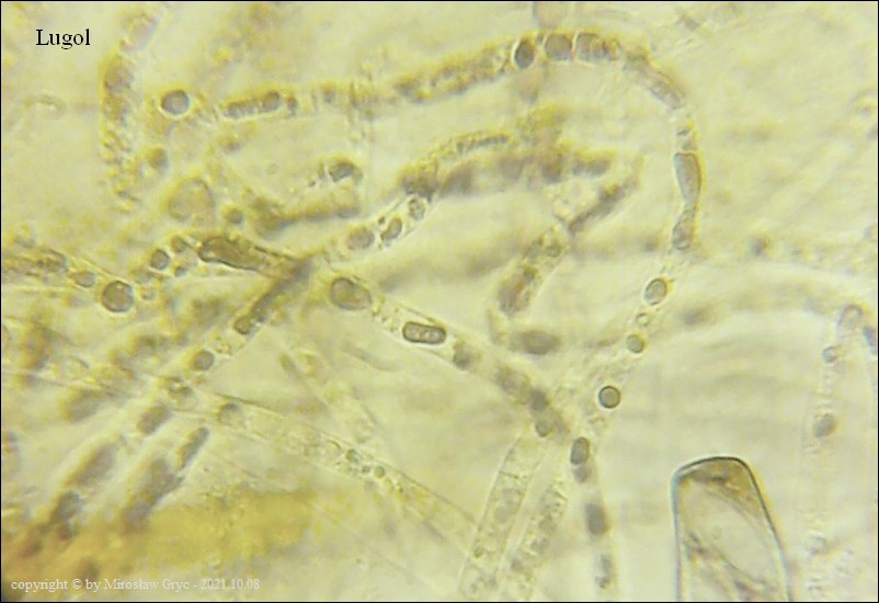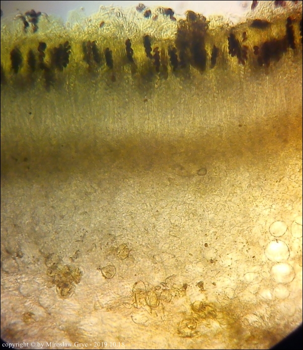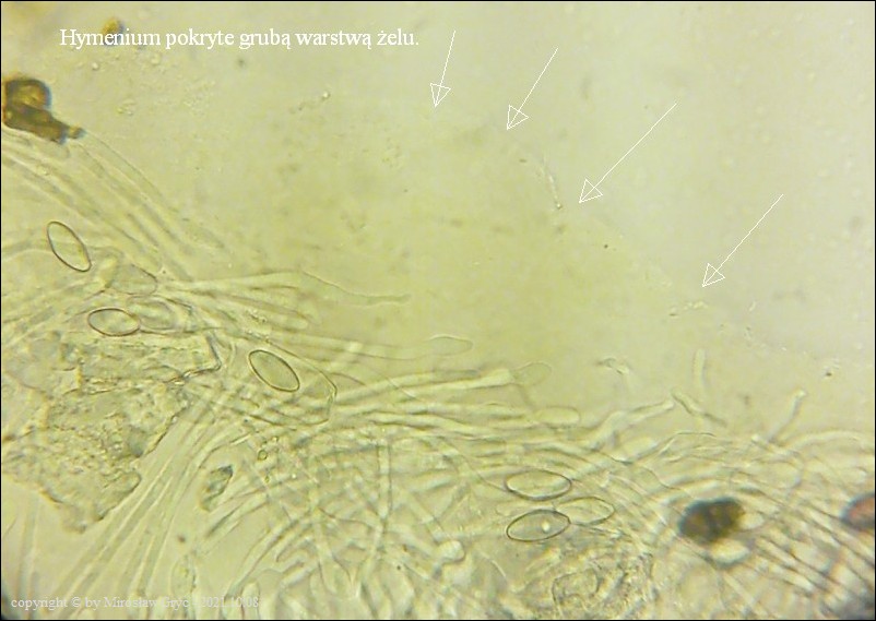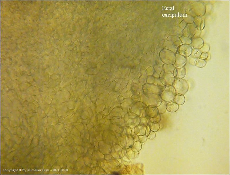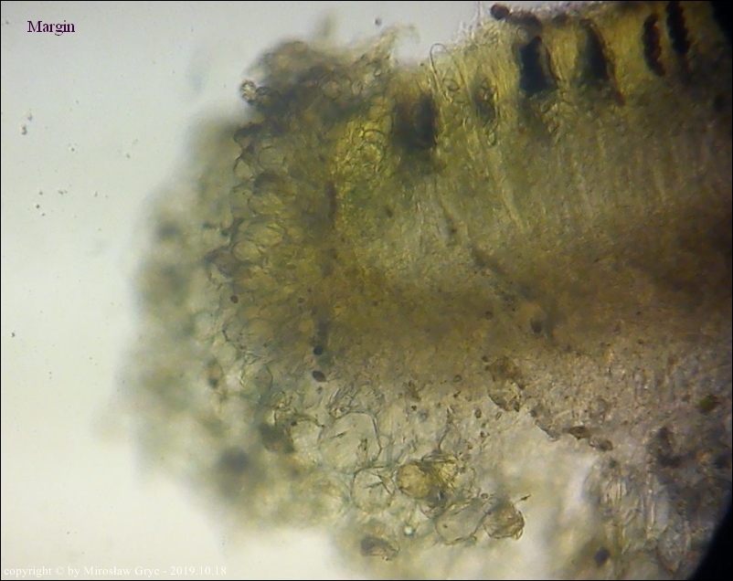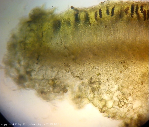 Notatka: W chwili znalezienia, na szyszce wyrastał jeden zupełnie niedojrzały owocnik. Pozostałe zostały wyhodowane w warunkach sztucznych, w amatorskiej dojrzewalni. Zarodniki: (15.8) 16.3 - 18.1 (18.2) × (7.9) 8.3 - 9.4 (9.7) µm Q = (1.8) 1.82 - 2.07 (2.1) ; N = 21 Me = 17.2 × 8.8 µm ; Qe = 2. Dolne partie worków pod wpływem lugolu lekko przebarwiają się na niebiesko.