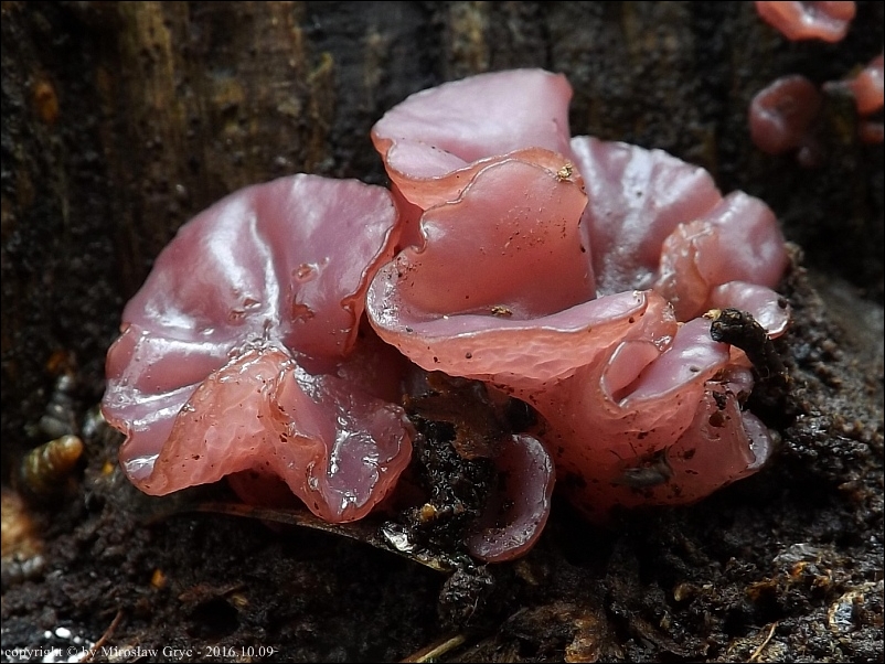 Owocnik doskonały kształtu miseczkowatego lub odwrotnie stożkowatego, siedzący na krótkim trzonie, średnicy 0.5-1.5 cm, barwy purpurowoczerwonej lub fioletowoczerwonawej, galaretowaty.