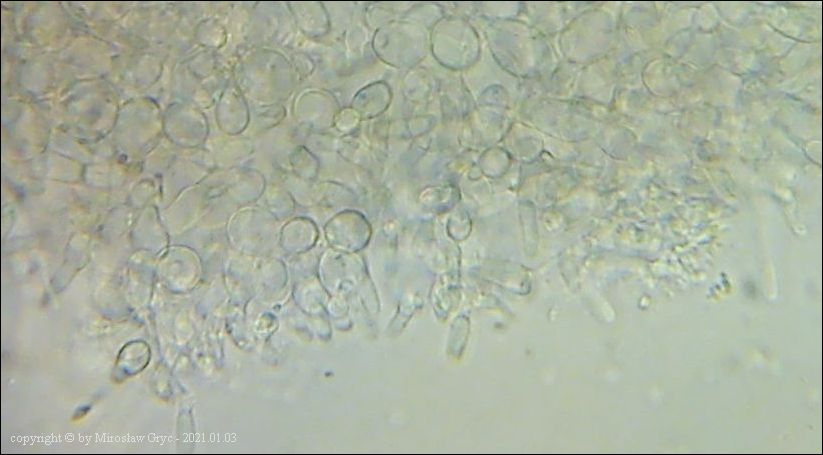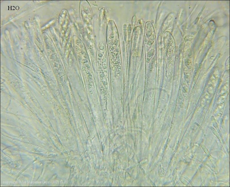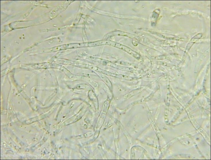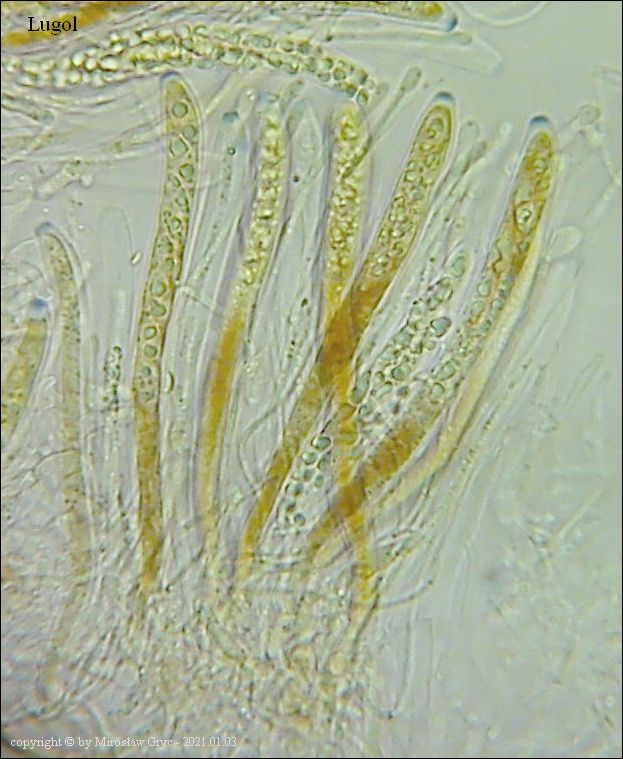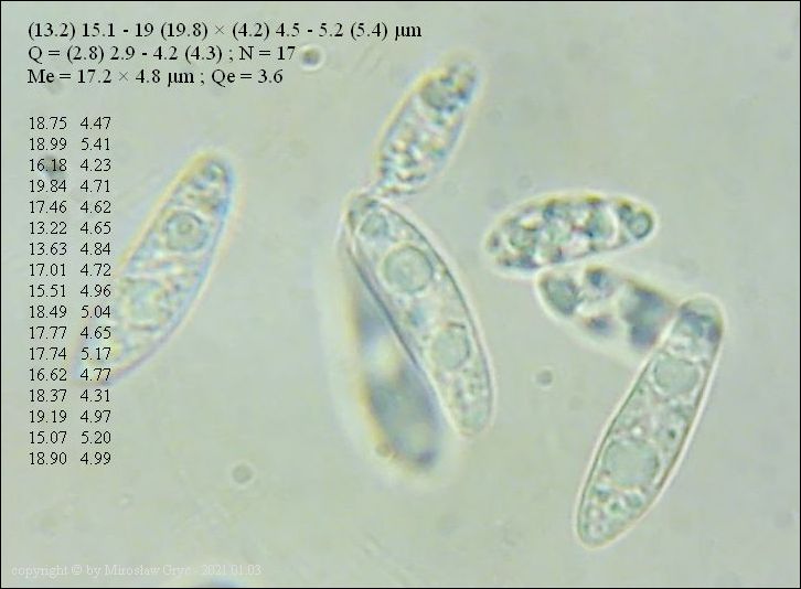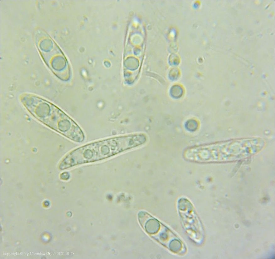 Zarodniki o wymiarach 10-20 x 3-5 µm, bezbarwne, wrzecionowate, gładkie.