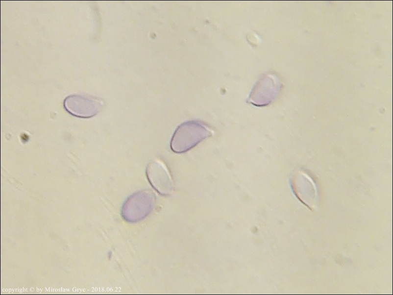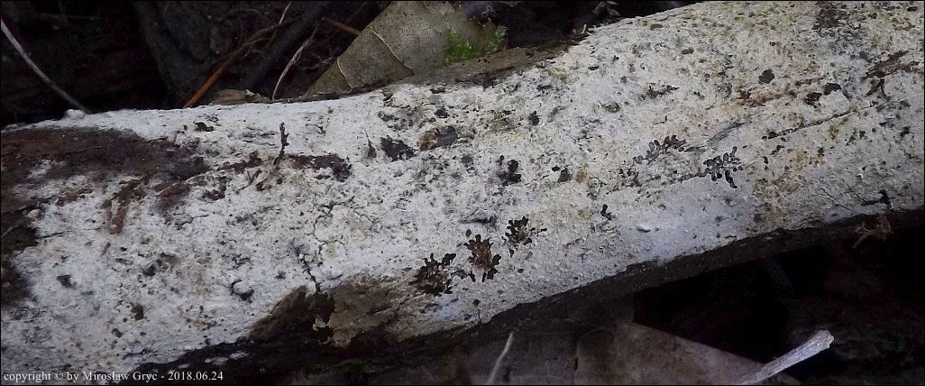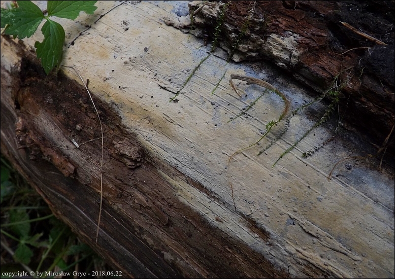 Substrat: Owocnik rozpostarty na dolnej stronie pnia liściastego, leżącego na wilgotnej ziemi.