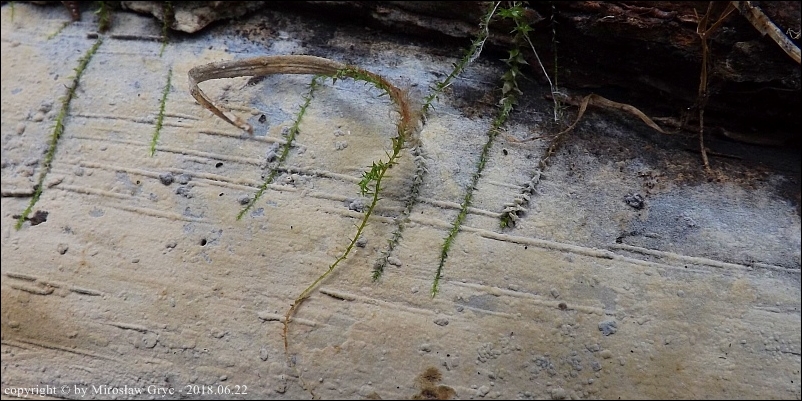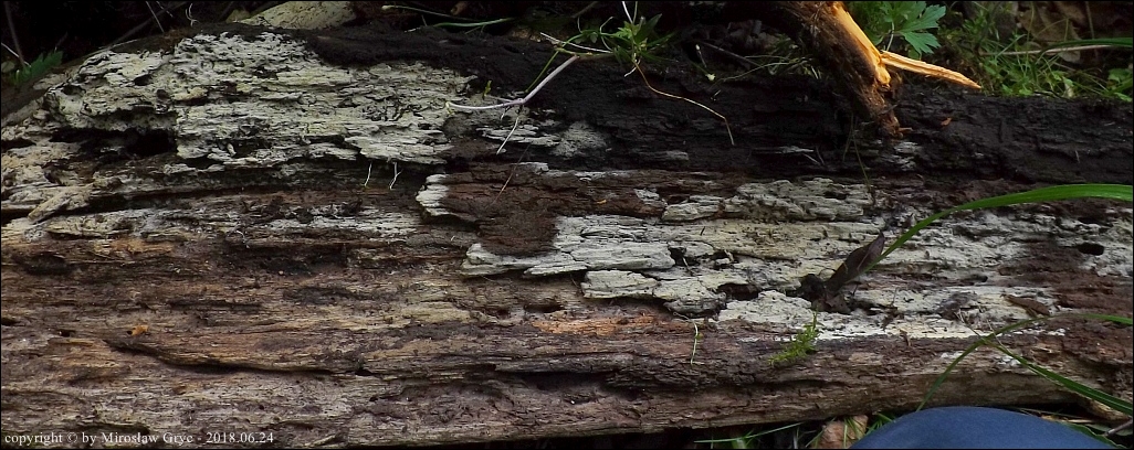 Substrat: Owocnik rozpostarty na pniu, niewiadomego pochodzenia, leżącym na wilgotnej ziemi.
