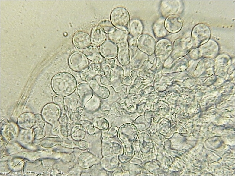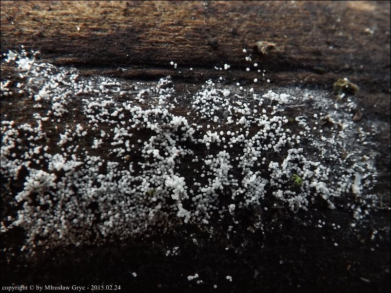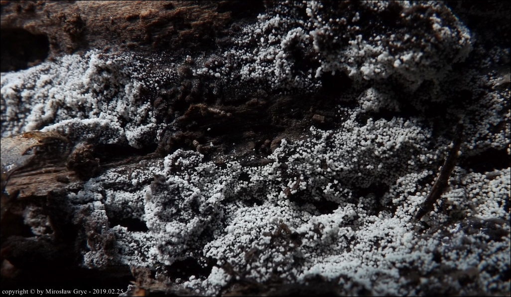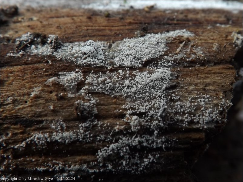Substrat: Teren wilgotny, owocniki na dolnej stronie fragmentu drewna.