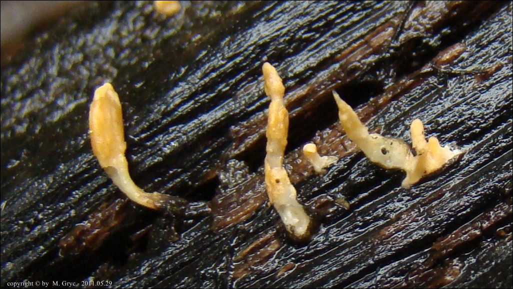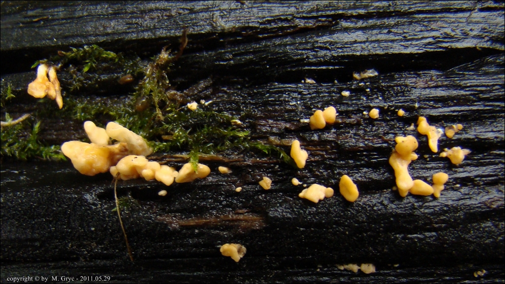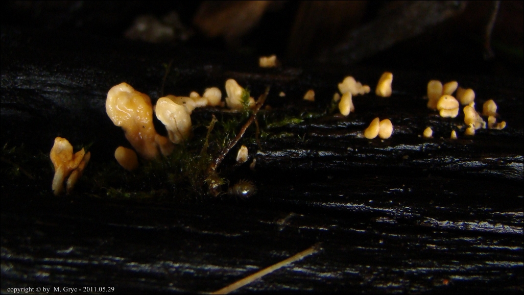 Substrat: na kawałku drewna (prawdopodobnie dębowego), kilka owocników w sąsiedztwie próchnilca gałęzistego.