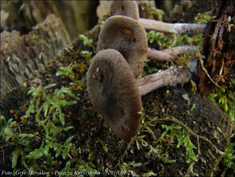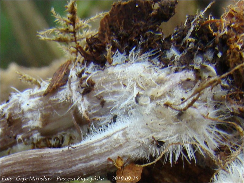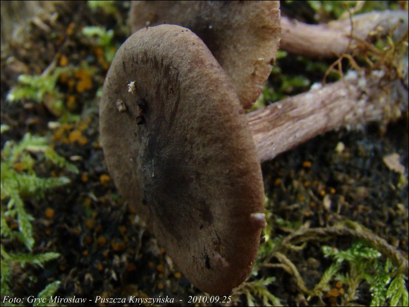Trzon: barwy bardzo zbliżonej do barwy kapelusz, cała powierzchnia lekko włókienkowata; u podstawy występują bogate sznury grzybni (fot.05).