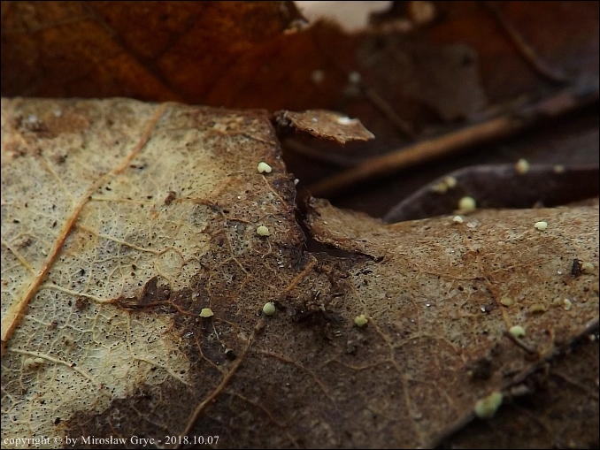 Substrat: Owocniki na wilgotnych liściach dębu (Quercus), leżących w zagłębieniu terenu.