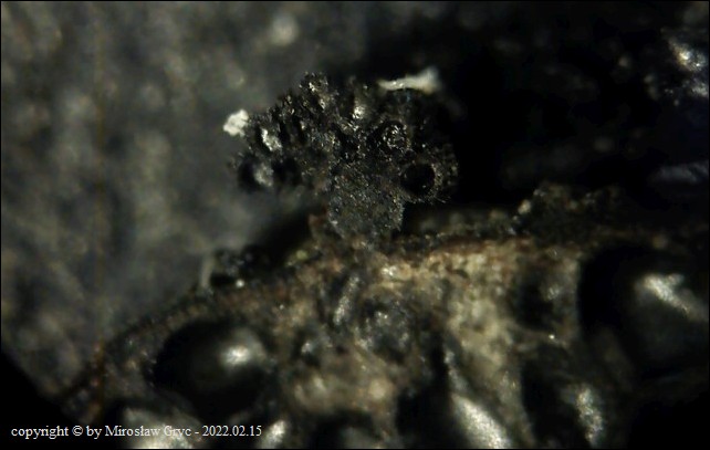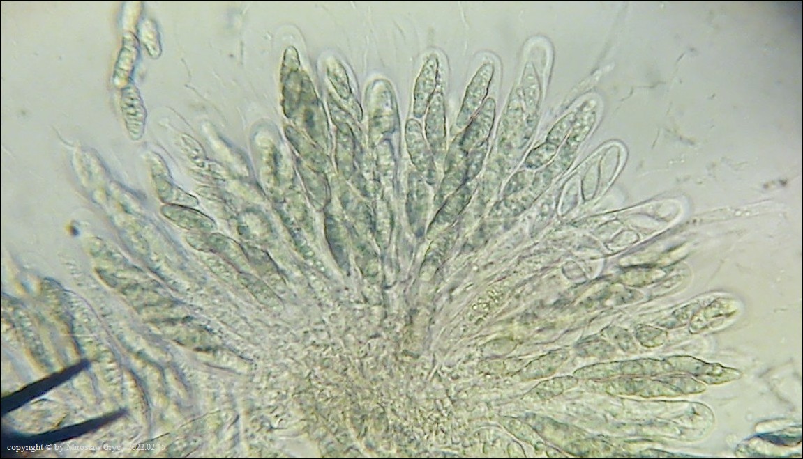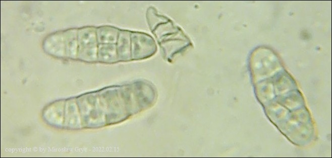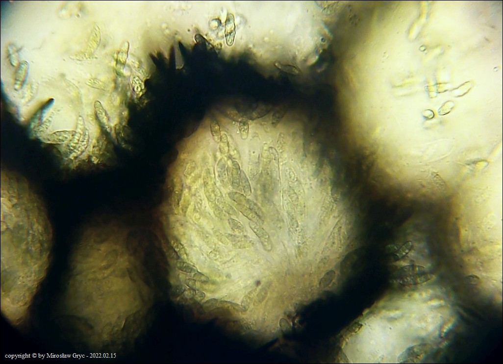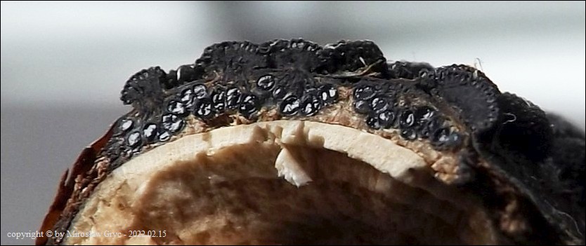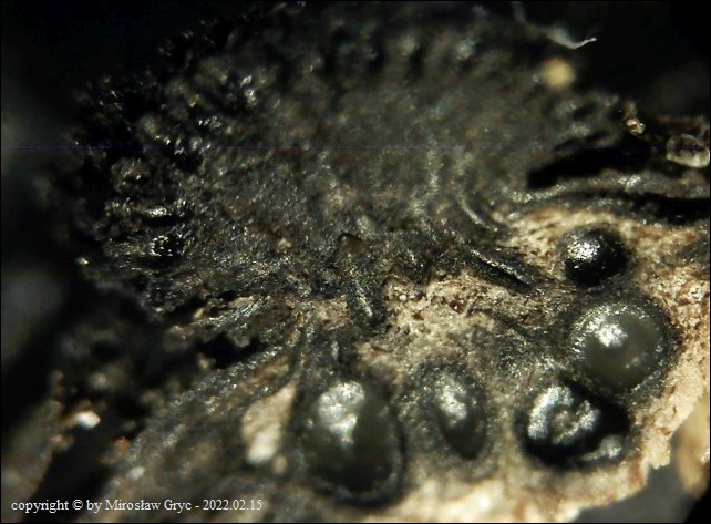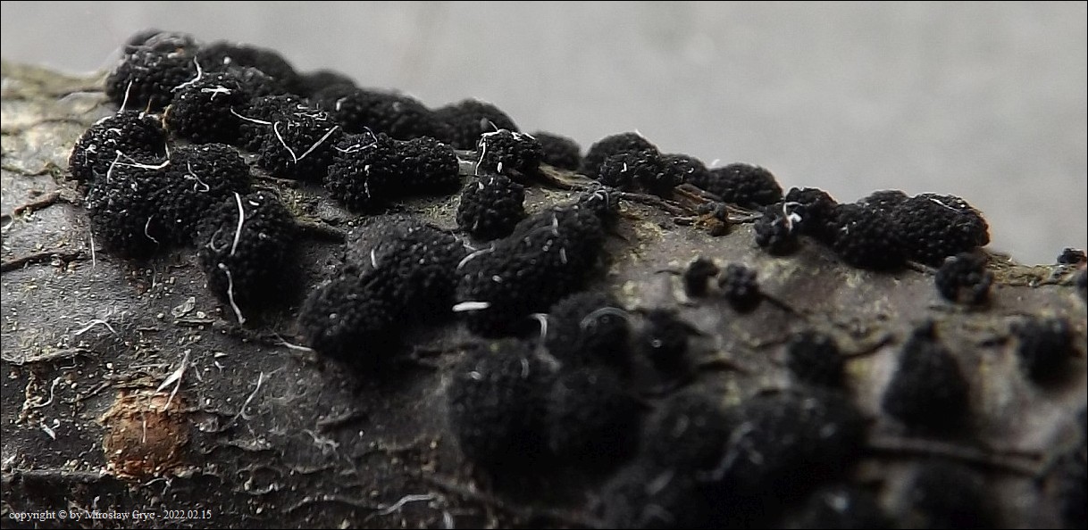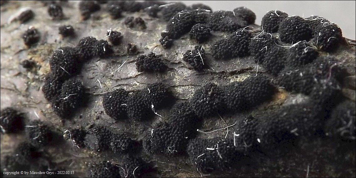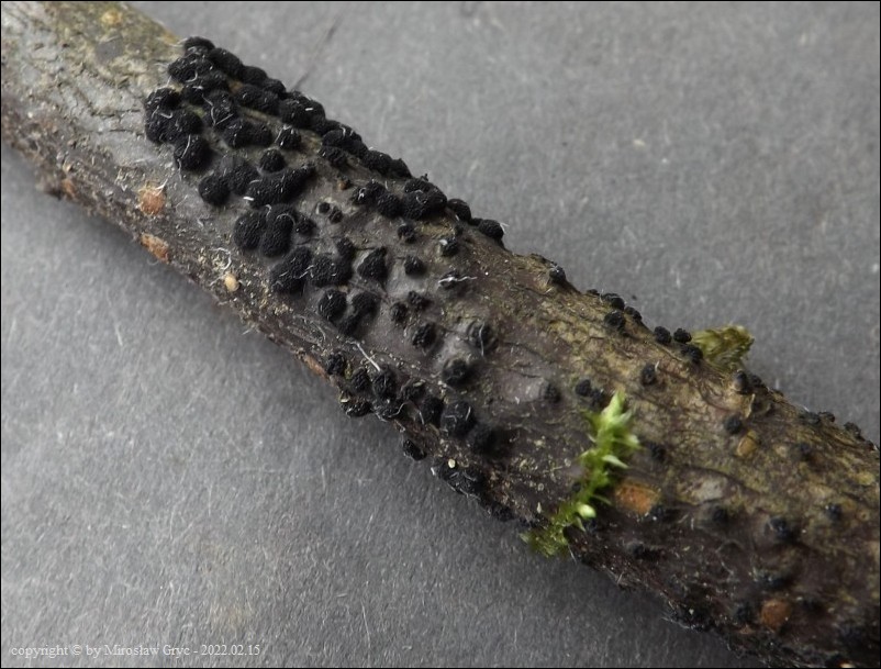 Substrat: Owocniki na martwych gałęziach czeremchy zwyczajnej (Prunus padus) .
