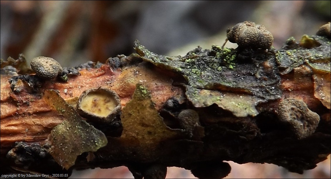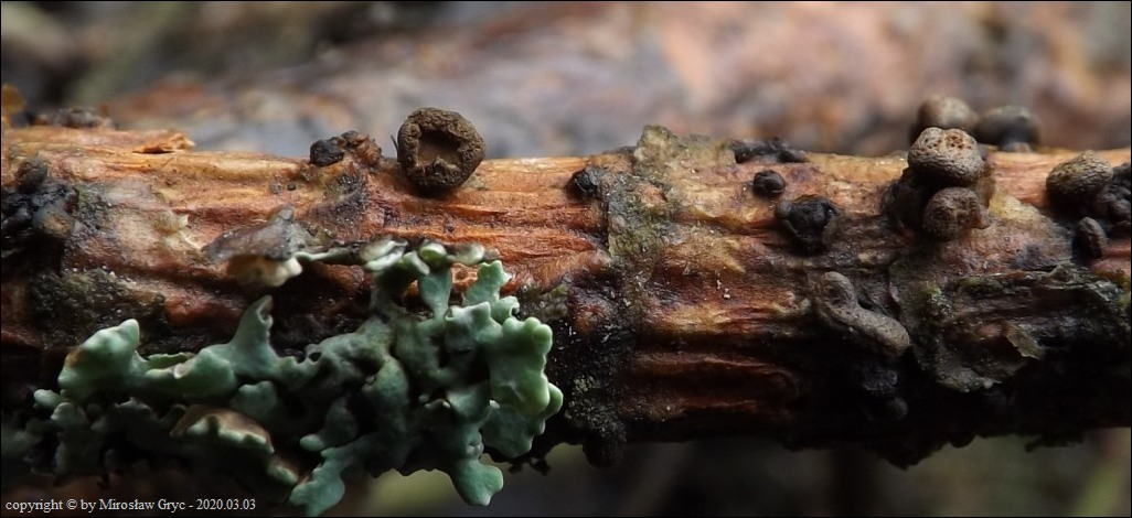 Substrat: Owocniki na gałęziach sosny (Pinus sylvestris) , leżących na kupie chrustu.