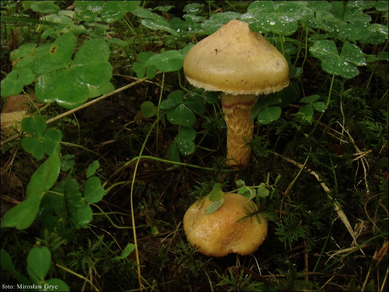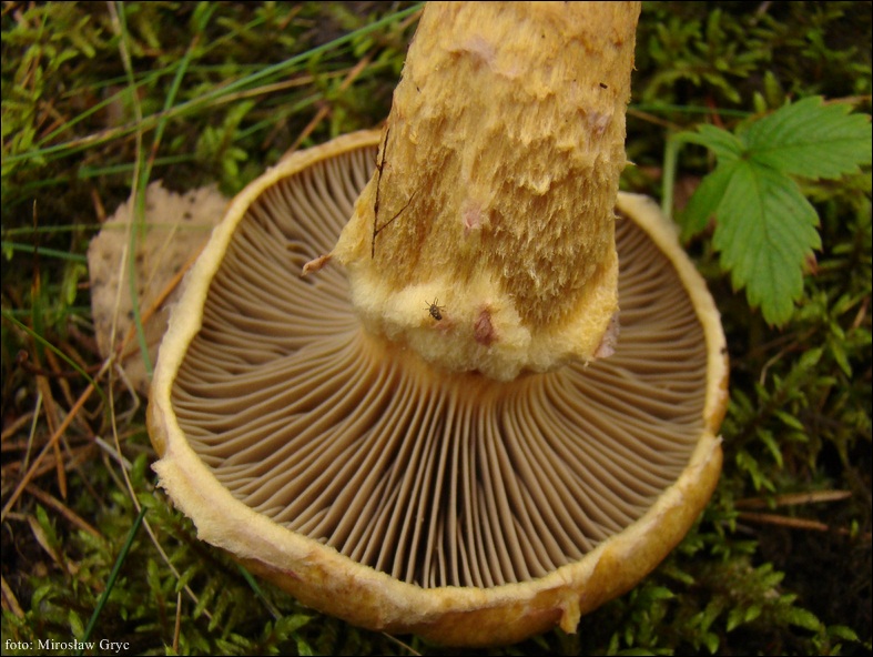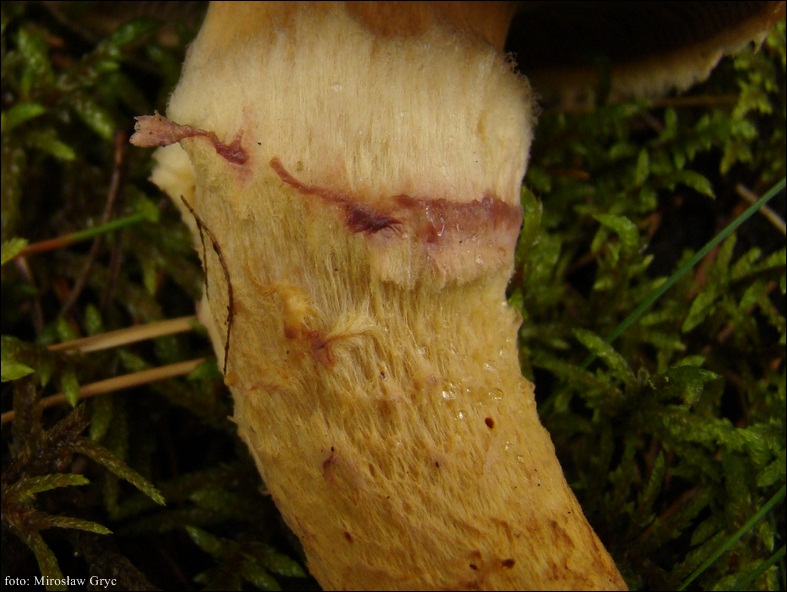 Trzon: zazwyczaj zwężający się ku podstawie, barwy żółtobrązowej, pokryty miedzianobrązowymi włókienkami szczególnie silnie u owocników młodszych i w okolicach strefy pierścienia; pierścień wyraźny, lepki; powierzchnia sucha.