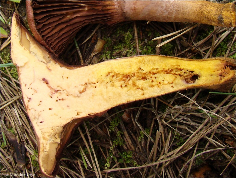 Blaszki: rzadkie, barwy purpurowobrązowej, z wiekiem ciemnobrązowej do czarnobrązowej, zbiegające na trzon.
