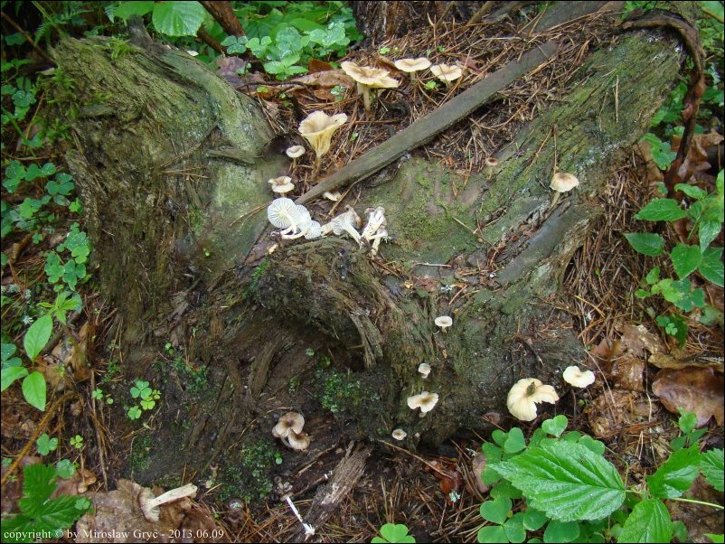 Substrat: Owocniki wyrastają na dwóch mocno już zbutwiałych pniakach.