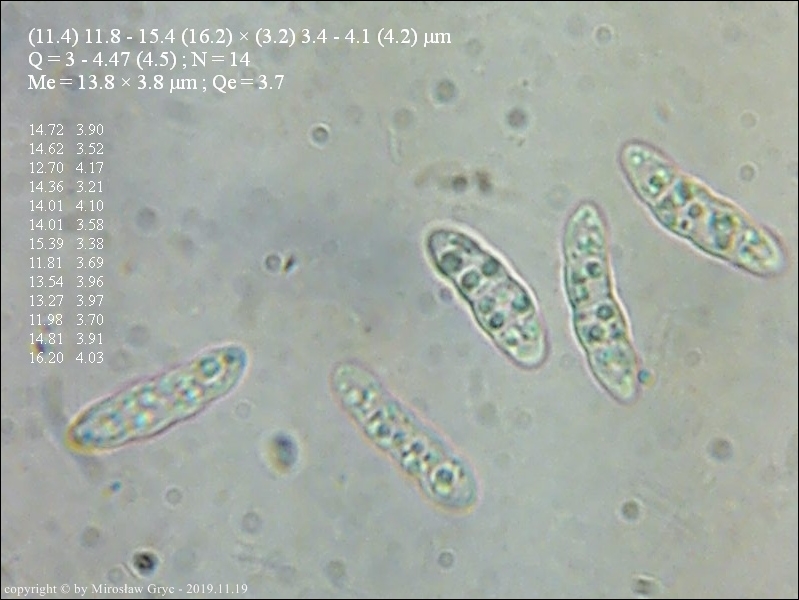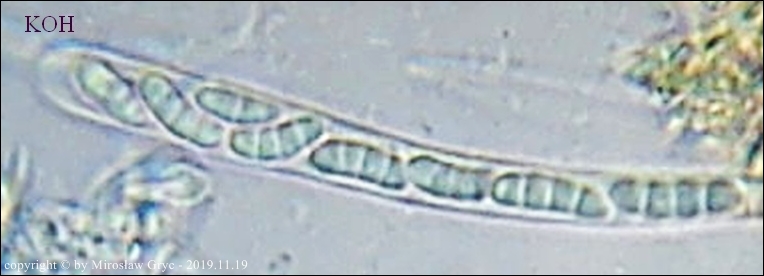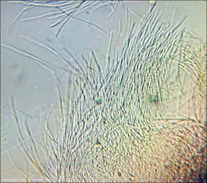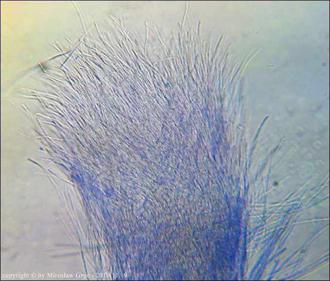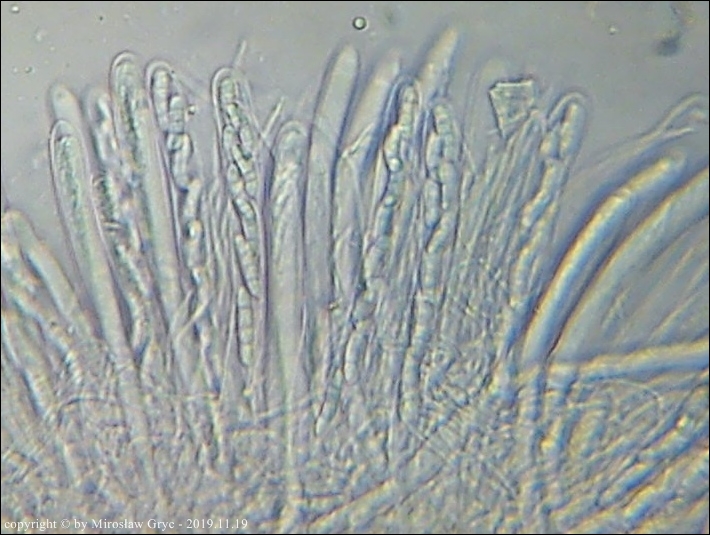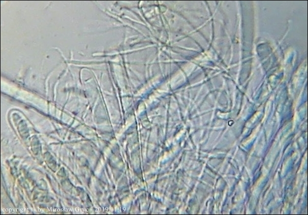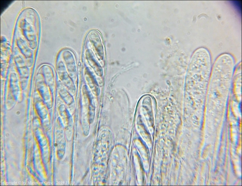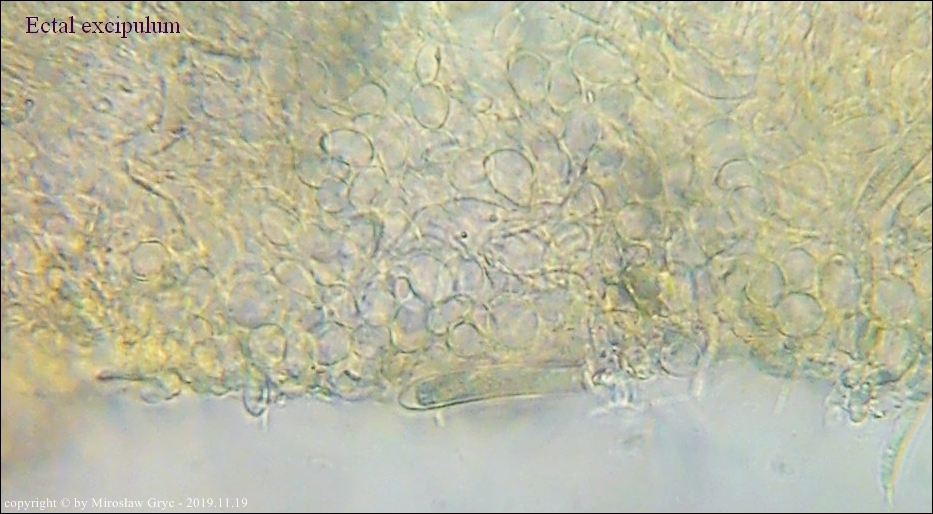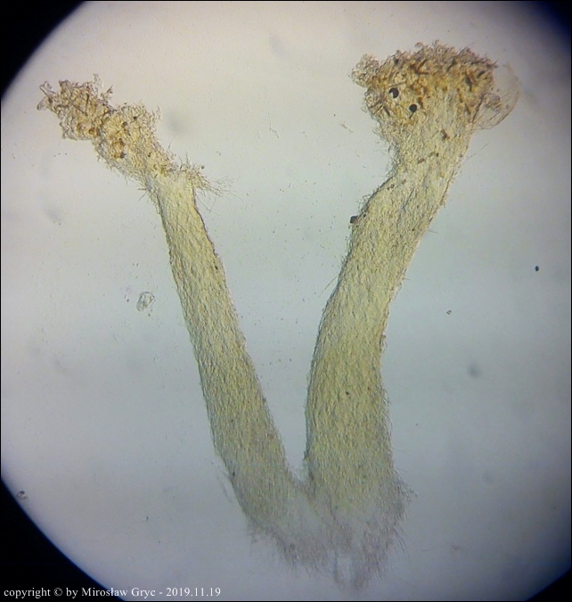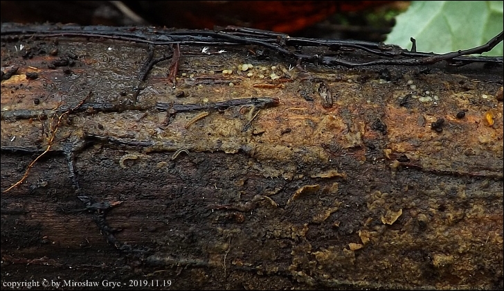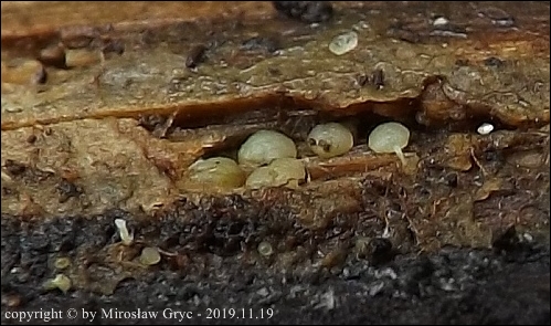 Substrat: Owocniki na dolnej stronie butwiejącego pniaka, niewiadomego pochodzenia (brzoza?).