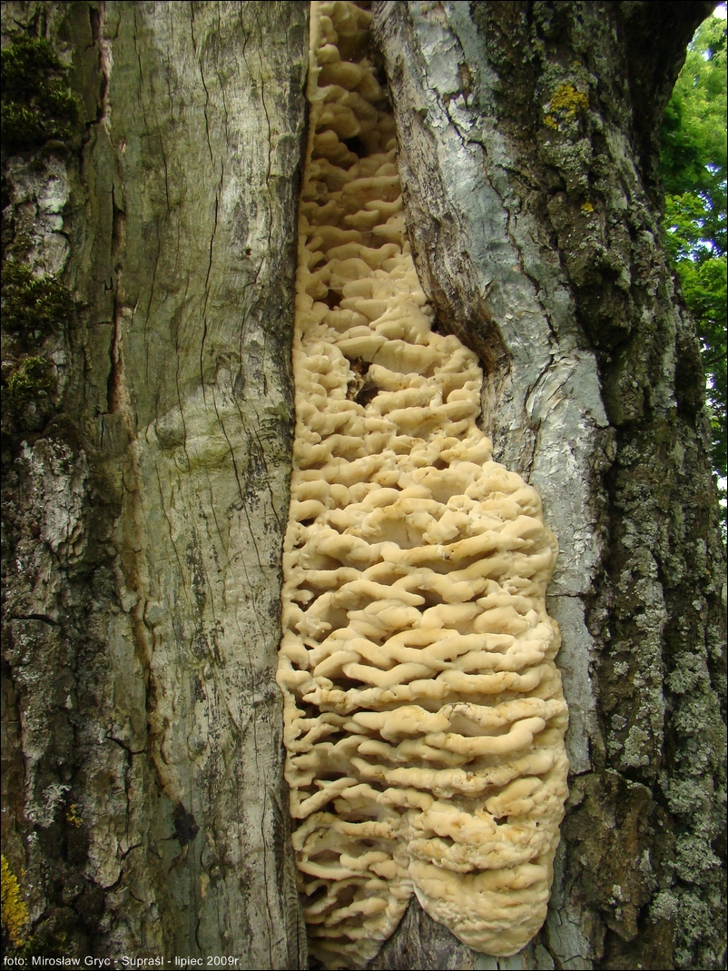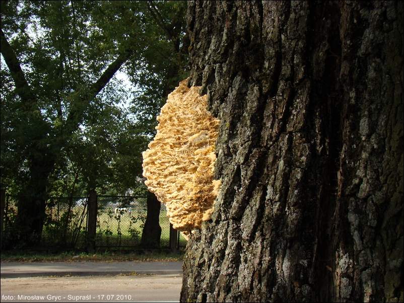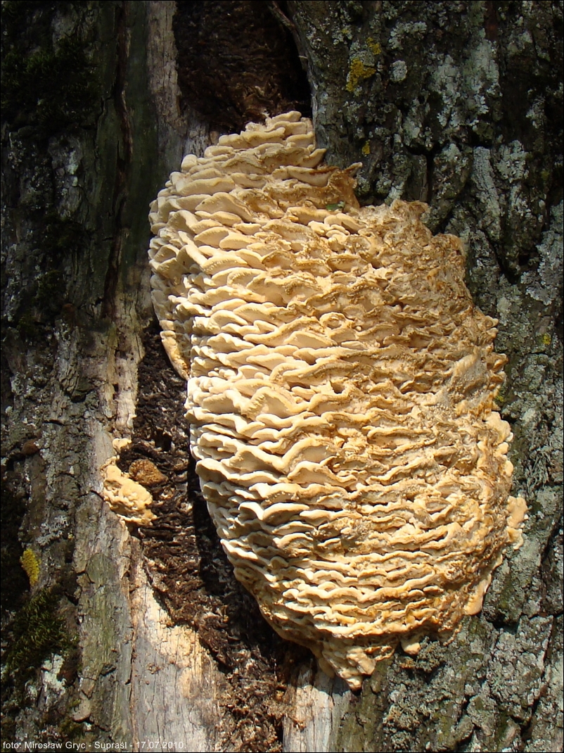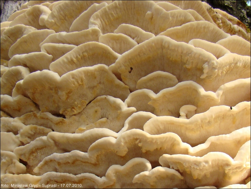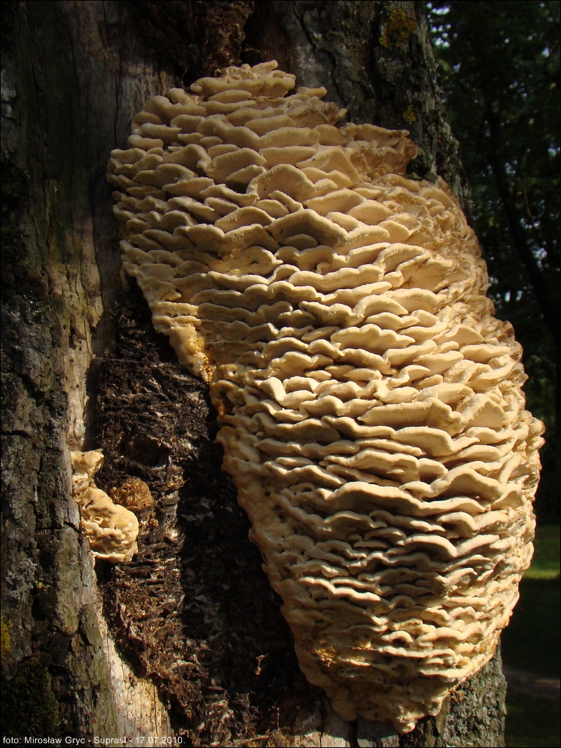 Owocniki duże i masywne. Okaz obserwowany przeze mnie, w 29 roku, wysokością osiągał około 60-70cm. W pierwszym roku wzrostu szerokość jego wynosiła około 30cm. Owocnik z 2010 roku miał już nieco mniejszą wysokość, za to jego szerokość oscylowała w granicach 40 cm. Pomimo, że jednoroczne, to bardzo trwałe. Z powyższego przykładu widać, że potrafią utrzymywać się na drzewie jeszcze przez kilka lat. Złożony z szeregu, pozrastanych ze sobą dachówkowato kapeluszy w ten sposób, że tworzy jedną całość mocno pzytwierdzoną do pnia. Pojedynczy kapelusz o krawędzi początkowo tępej, z wiekiem coraz bardziej ostrej, prostej lub też pofalowanej. Górna powierzchnia wyraźnie pokryta gęsto, drobnymi włoskami. Barwa początkowo prawie biała , poprzez kremową, z wiekiem przechodzi w coraz bardziej żółtą.