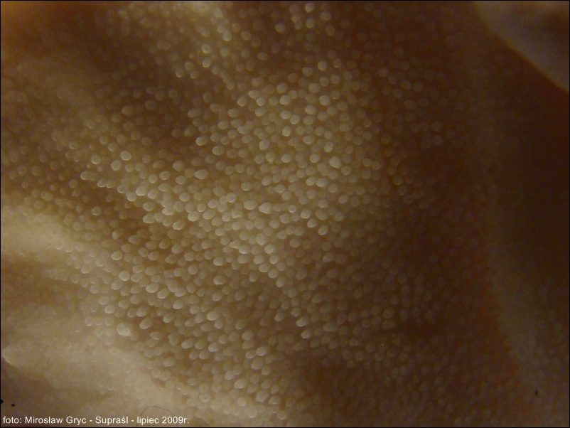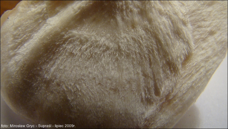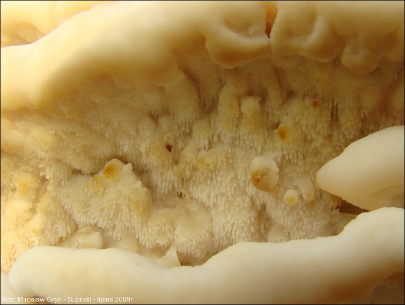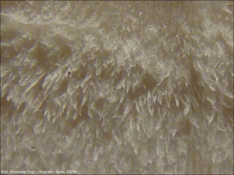 Hymenofor złożony z gęsto usianych drobnych kolców o barwie kapelusza.
