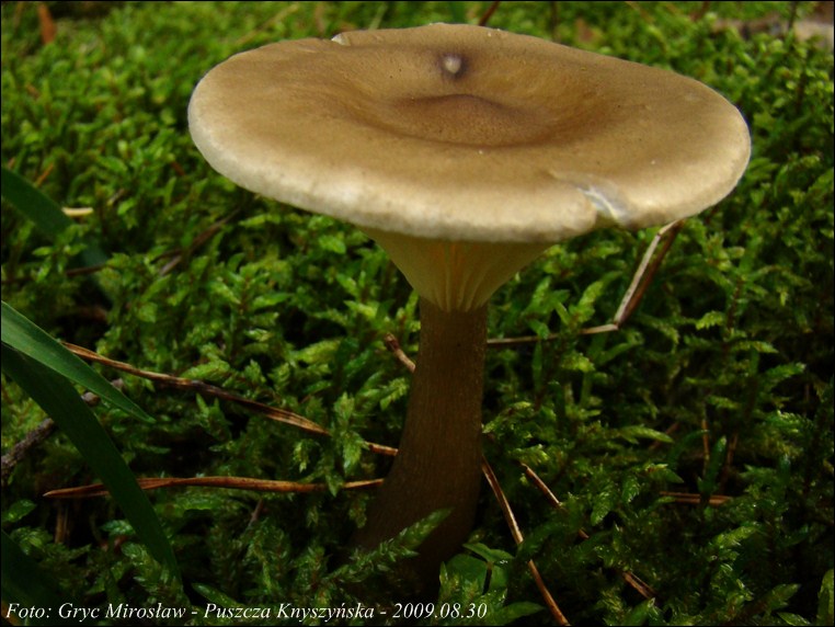 Kapelusz: zazwyczaj o wymiarach 4-6(7) cm, mocno higrofaniczny w związku z czym barwy zmiennej, suchy bladoochrowy, mokry oliwkowoszary lub szarobrązowy; młode owocniki kształtu wypukłego, zazwyczaj z tępym garbkiem, potem płaskiego aż do wklęsłego; brzeg ostry, w młodym wieku lekko podwinięty, delikatnie prążkowany; powierzchnia sucha i gładka.