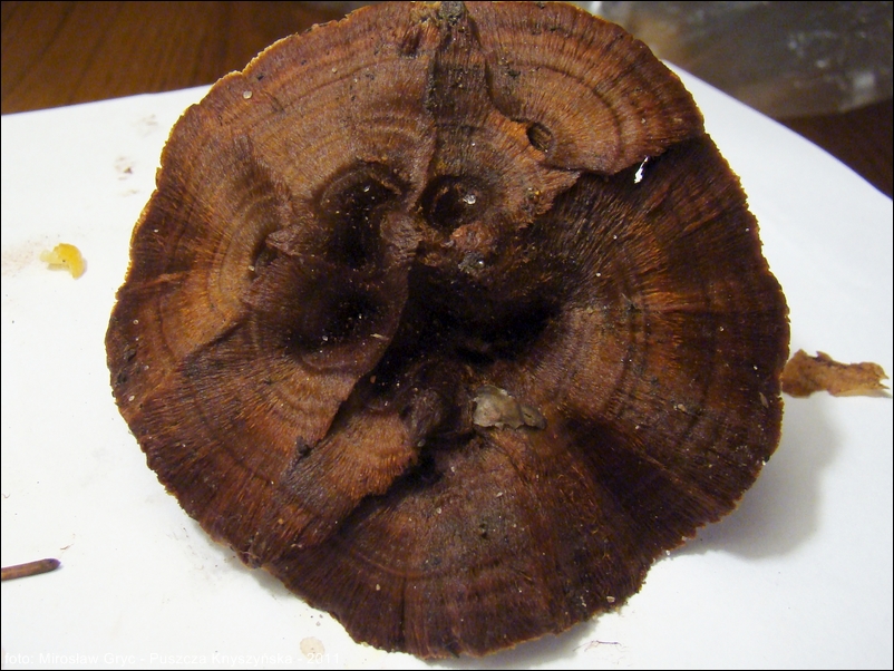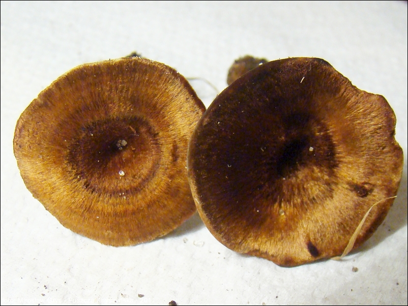 Kapelusz: najczęściej w formie rozpostartej z głębokim centralnym lejkiem (dołkiem); brzeg w czasie wilgotnej pogody w zasadzie całkowicie rozpostarty , wyschnięte zazwyczaj maja je podwinięte (fot. 18-19); w zależności od wieku, brzeg może być bardziej równy lub też postrzępiony co widać na zdjęciach zamieszczonych w galerii (fot. 15-17); barwa cynamonowa z intensywnym połyskiem u owocników suchych i młodych, cynamonowobrązowa lub brązowa u owocników namokniętych i zdecydowanie z mniejszym połyskiem; powierzchnia zazwyczaj delikatnie strefowna; brzeg znacznie jaśniejszy, żółty a nawet prawie biały u owocników jeszcze młodych i w średnim wieku, u starszych zabarwienie bardziej jednolite