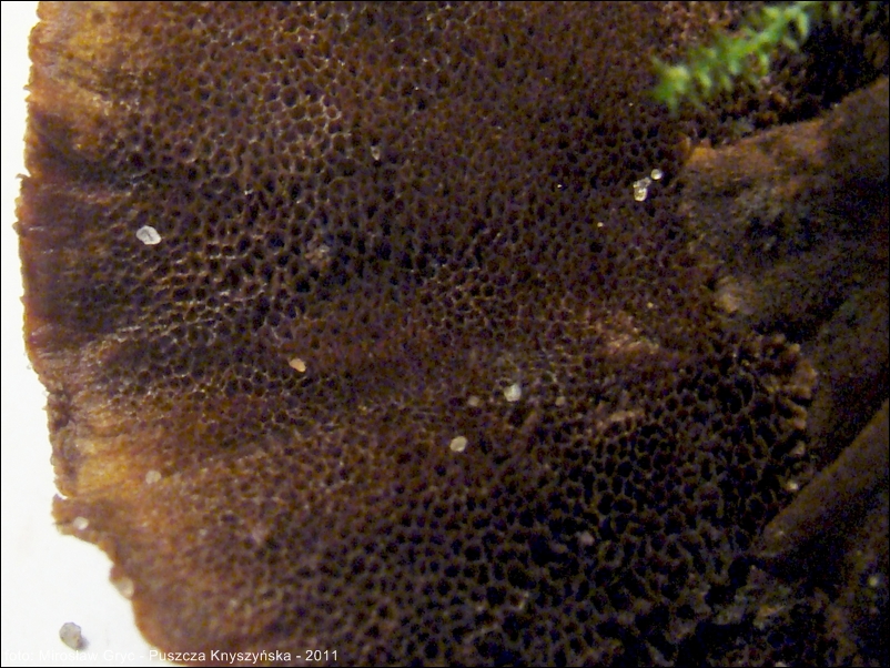 Pory: od okrągłych do kanciastych, 2-3 na mm; barwy zazwyczaj od jasno do ciemno brązowej lub też cynamonowobrązowej, uszkodzone lub uciśnięte nie zmieniają barwy.