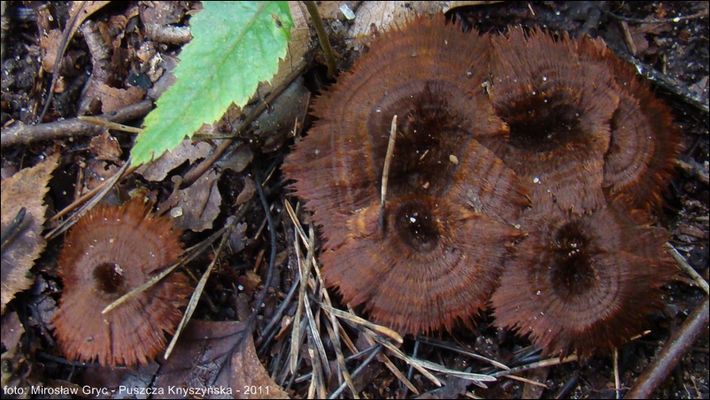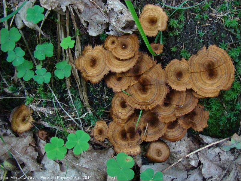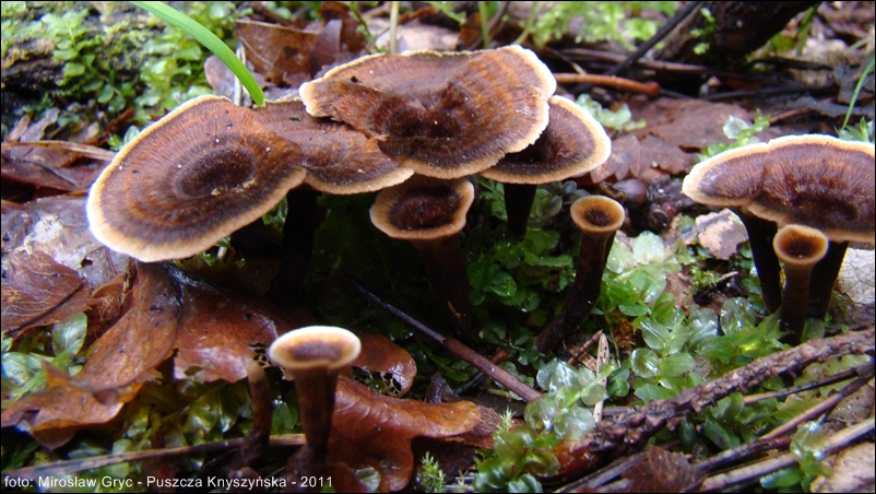 Lokalizacja: Pas przeciwpożarowy w lesie ze znaczną przewagą liściastych. Stanowisko bardzo mocne. Kilkadziesiąt owocników rozsianych na znacznej powierzchni.